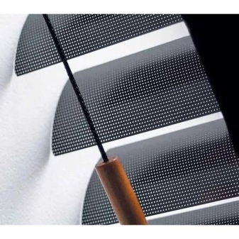 In addition to aluminum, perforations are also found in wooden blinds. They create a unique comfort, and the holes facilitate the construction, because the lamellae made of wood are quite heavy.This option will be very environmentally friendly, here the edges of the holes are not so sharp and the thread is less prone to rubbing, but this material has drawbacks. Wet cleaning design is contraindicated, only dry cleaning. In addition, they have a high cost.