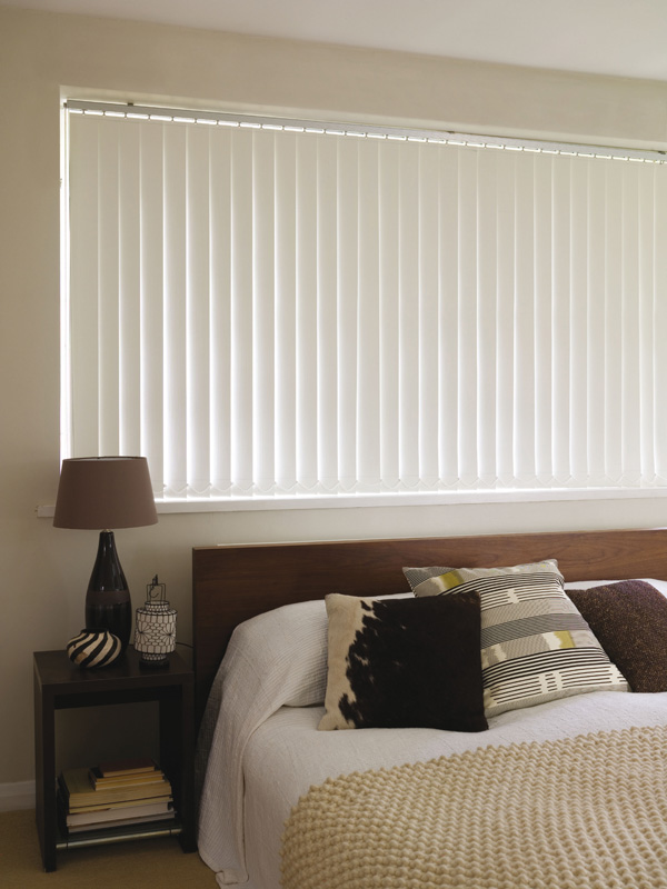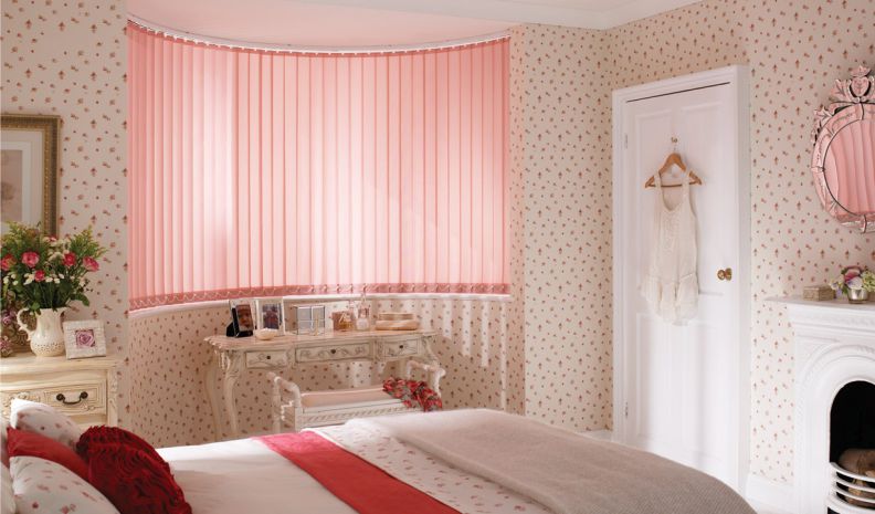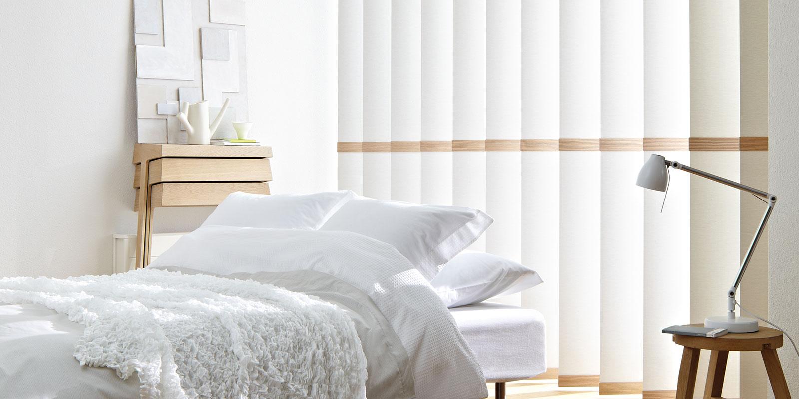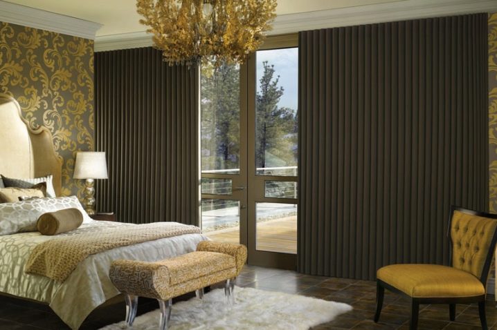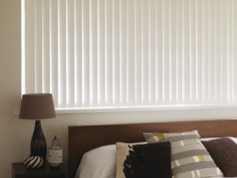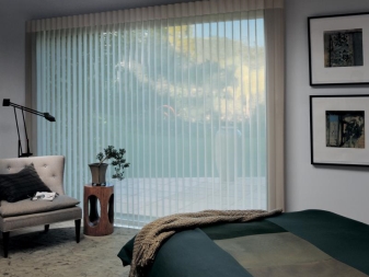 - Vertical blinds - Their distinctive feature is that the lamellae are located in a vertical position. They are made of various materials - there are plastic, wooden, aluminum and fabric versions. The main advantage of this accessory for the bedroom window is the ability to gently push the slats from the center to the edges of the product. You can also move the vertical blinds either to the right or to the left. This option allows you to beautifully decorate the windows not only standard but also arched. With their help, in addition to everything else, you can zone the space using it as a partition. It will also please the price range, because both expensive and budget models are presented.
