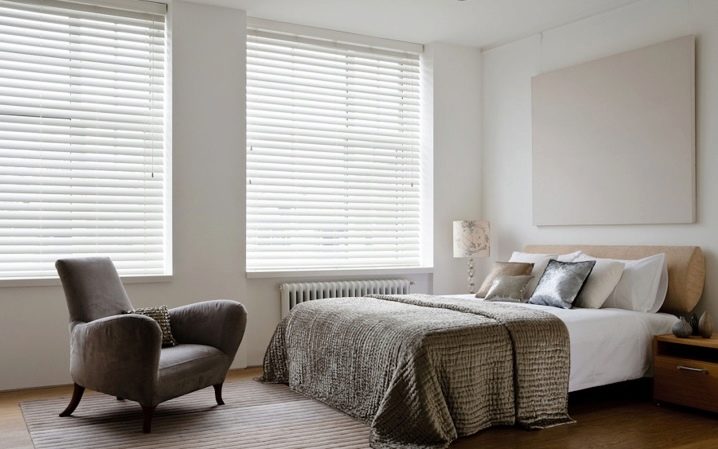 - Horizontal blinds are the most popular and sought-after model due to its compact dimensions, the ability to change the degree of illumination of the bedroom.This type of decor is presented in a wide variety of materials used for production. There are aluminum, plastic, wood, bamboo and fabric blinds. Due to such a wide range of textures, this accessory will easily fit into a diverse bedroom design. The width of the slats of horizontal blinds varies from 1.6 to 2.5 cm.