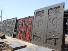 Rentable dans le chalet d'été aura l'air massive portes noires avec de grands motifs d'or. Il est possible de placer la porte, faite dans la même technique. Les installations les plus rentables de ce type seront situées à côté des maisons en briques. Une bonne option serait des dessins décoratifs de nuances argentées.
