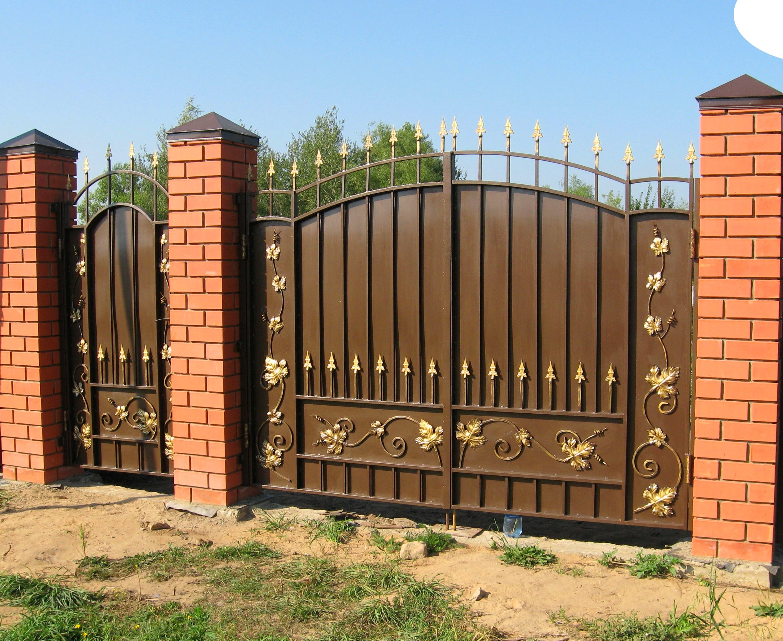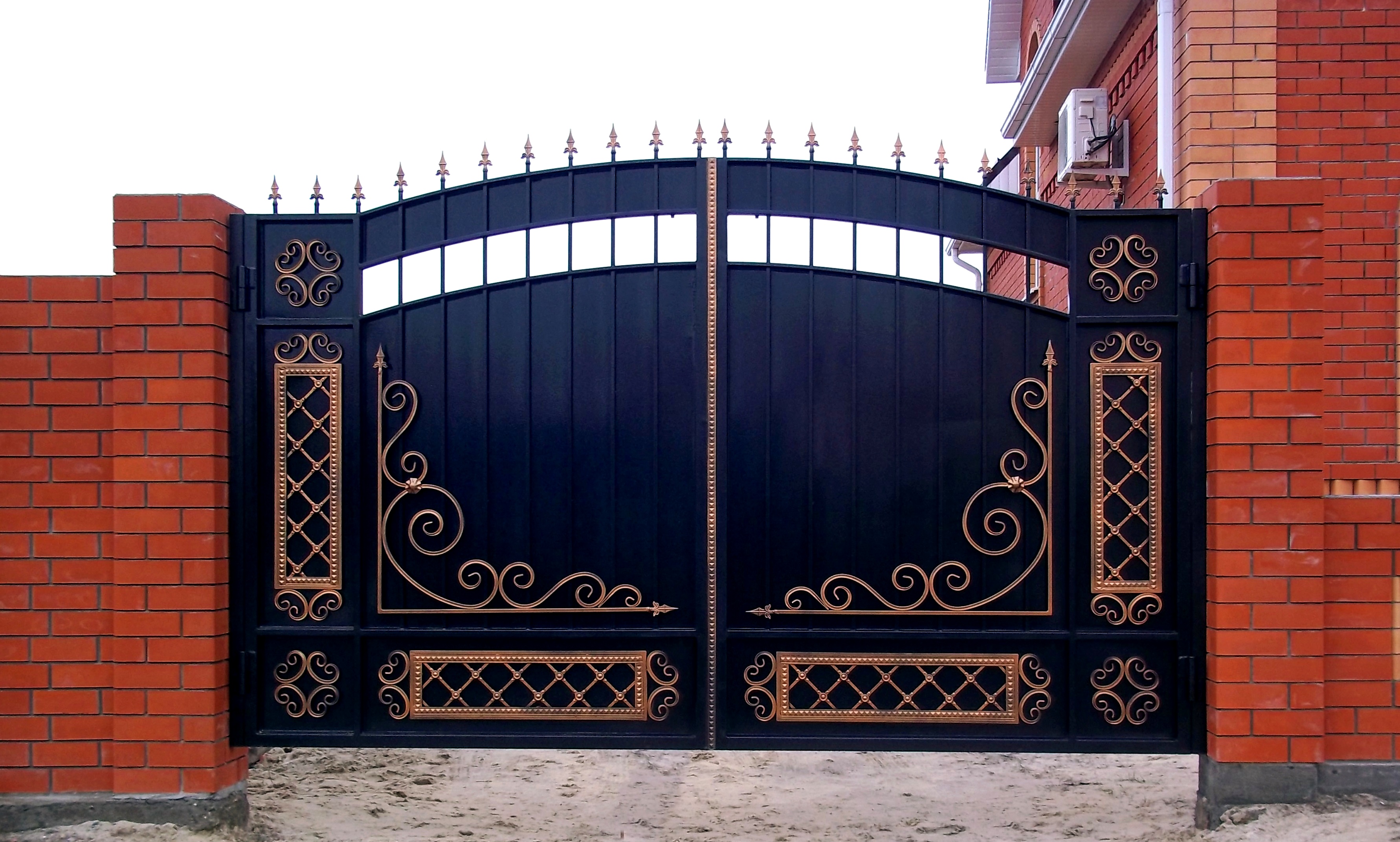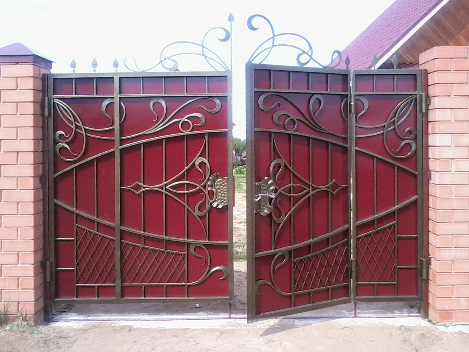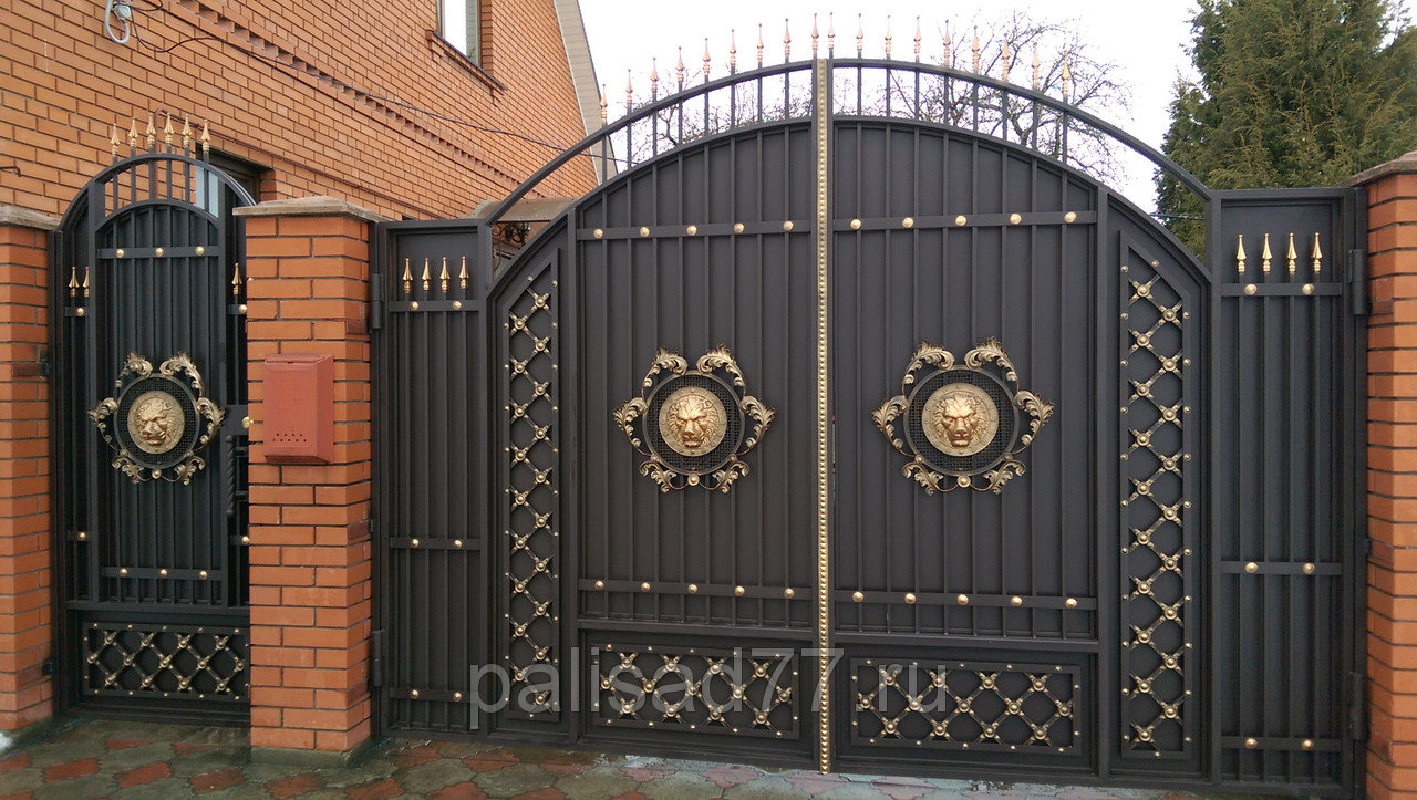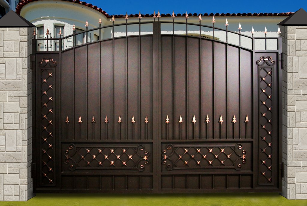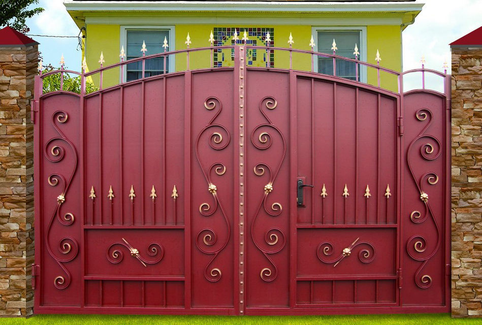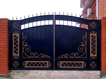 Les motifs sont tout à fait acceptables sur les attaches du cadre et sur les poignées. Il est à noter que la combinaison d'éléments décoratifs de différents types et de différents matériaux peut rendre votre portail trop surchargé, ridicule. Vous devez faire attention lorsque vous choisissez des solutions de couleur pour les objets de conception, base métallique.