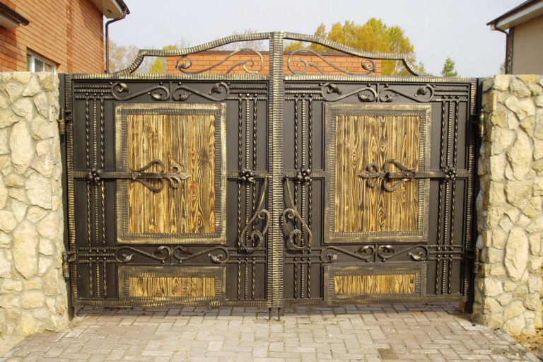 Souvent, la porte est faite sous le "vieux". Cet effet utilise une variété de gros détails grossiers. Cette conception peut être facilement créée en utilisant des objets forgés. Un nombre considérable de personnes utilise de beaux inserts en bois avec de petits dessins sculptés pour ce type de portail.