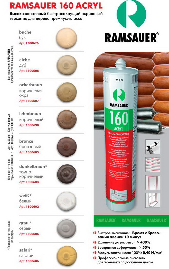 "Ramsauer Acryl 160" - cette composition est souvent utilisée lorsqu'il est nécessaire de sceller des joints entre des surfaces en bois et en béton, la formation et la formation d'un film protecteur se manifestent après 15 minutesAprès durcissement, la masse est caractérisée par une plasticité élevée - l’allongement à la rupture peut atteindre 500%.