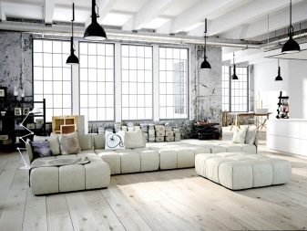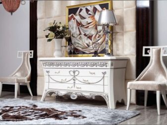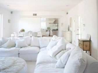 Tous les meubles peuvent être divisés en soft et cabinet. Les canapés, fauteuils, tabourets et chaises rembourrés appartiennent au doux. Il peut être entièrement encadré en blanc ou combiné avec d'autres nuances. Par exemple, le blanc peut n'être qu'un rembourrage ou que des parties du corps.