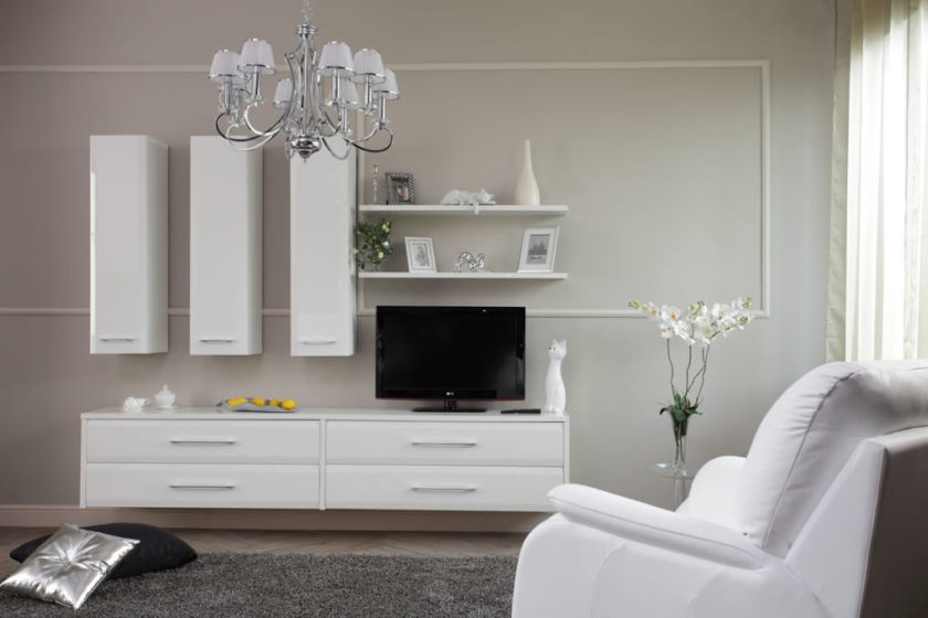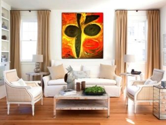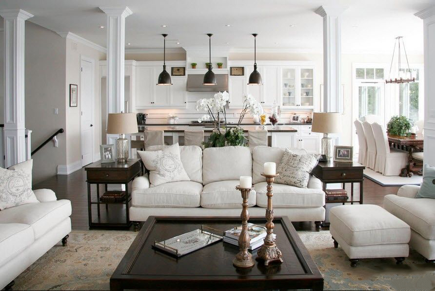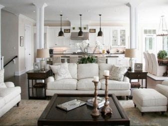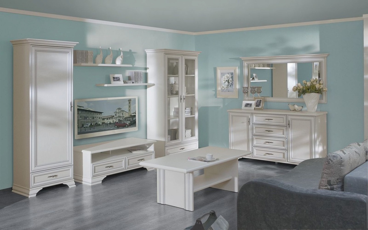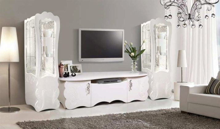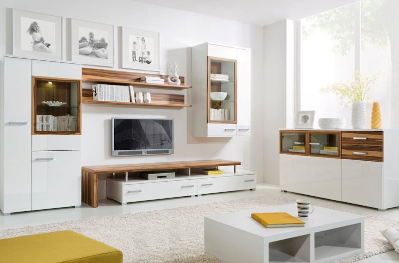 Les meubles blancs sont rarement utilisés pour la décoration de la pièce, ils sont décorés dans les mêmes tons. Cet intérieur a l'air terne et monotone. Par conséquent, le plus souvent utilisé couleurs auxiliaires ou dans le mobilier lui-même, ou dans la décoration de la pièce. Ils sont sélectionnés en fonction du style du salon.