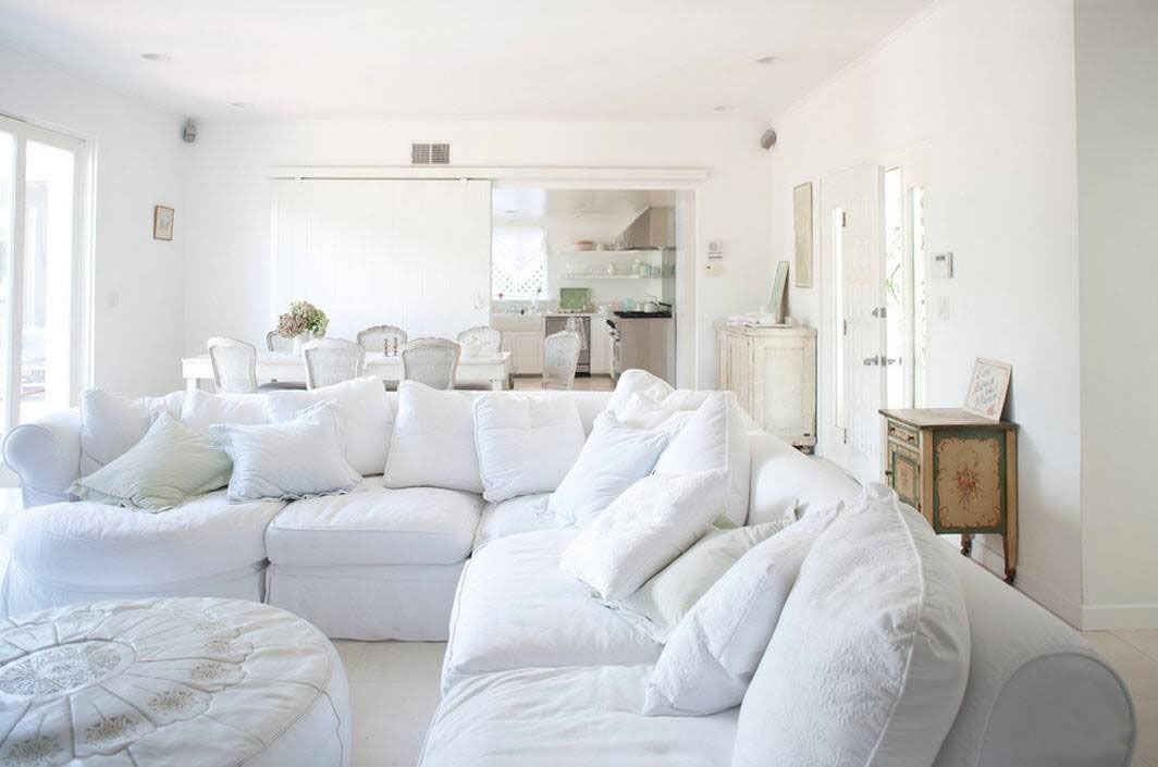 - Difficultés dans les soins. Toutes les imperfections sont clairement visibles sur la surface blanche. Les empreintes digitales et les divorces sont particulièrement bien imprimés sur les détails brillants.Par conséquent, si vous achetez un casque blanc ou un canapé, préparez-vous à un entretien régulier. S'il y a des enfants en bas âge ou des animaux domestiques dans la maison, cela peut valoir la peine de refuser.