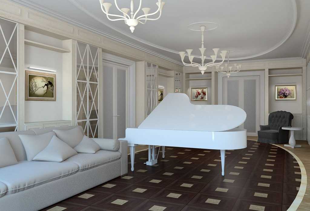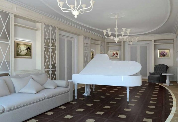 Ce style de design est propre aux demeures d'élite, aux salons d'exposition, aux palais de la culture. Le vrai piano à queue poli en blanc, qui peut décorer non seulement la salle de concert, mais aussi le salon de certaines actrices ou chanteuses vedettes, peut être considéré comme un chic spécial.