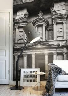 - Décorer la salle dans une direction de style classique néoclassique Il est nécessaire de privilégier les dessins gracieux dans des tons doux et naturels. Des images avec l’effet de l’antiquité, des vues architecturales de villes antiques ou des paysages romantiques sont majestueuses.