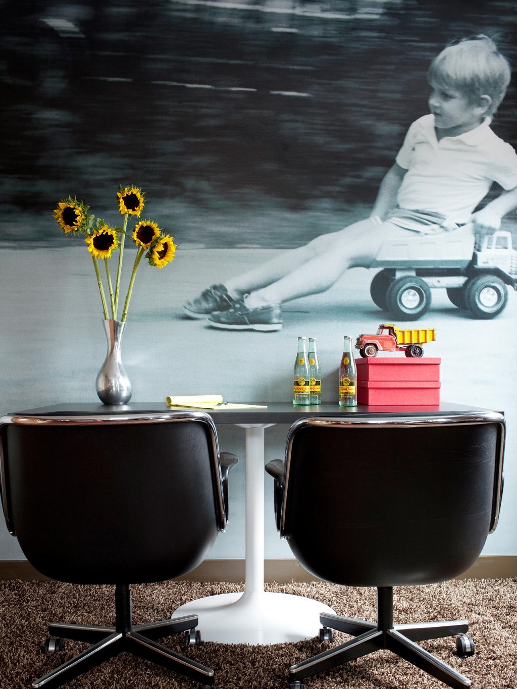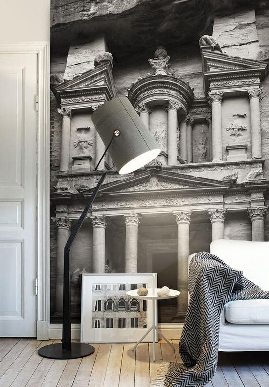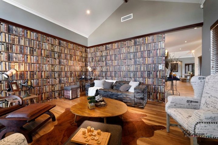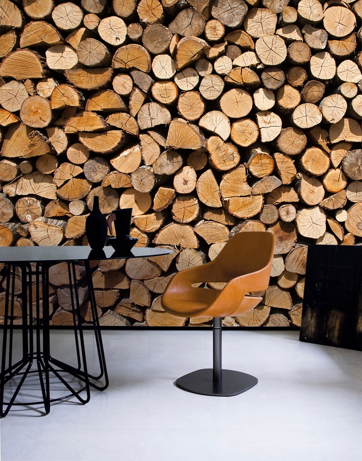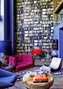 Une solution non standard serait d'utiliser du papier peint photo sur deux murs adjacents. L'angle unique résultant peut devenir une zone distincte de la pièce ayant une fonction fonctionnelle (par exemple, mettre l'accent sur la salle à manger). S'il y a une cheminée dans la pièce, le territoire environnant peut être transformé en papier peint orné de briques ou de pierres.Les hôtes qui aiment plaisanter sur les invités apprécieront le papier peint qui crée une certaine illusion (par exemple, une bibliothèque, une porte arrachée, la suite de la pièce, des objets créés avec un effet 3D).