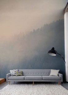 La décision la plus simple et la meilleure sera de placer le papier peint sur un mur exempt de meubles. Dans ce cas, il est possible de considérer l’ensemble de l’intrigue de la photo.Vous pouvez créer un coin de paix pour profiter du paysage avec une vue sur les montagnes, la forêt ou la mer en installant une table et quelques chaises près d'un mur, où vous pourrez vous reposer après une vie quotidienne difficile. Si vous ne pouvez pas libérer complètement le mur, vous pouvez utiliser du papier peint dont l’intrigue ne souffre pas beaucoup si ses parties sont fermées.