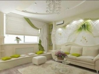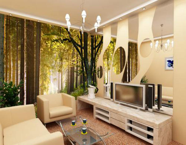 Le remplissage panoramique avec des papiers peints photo vous permet de plonger complètement dans l’espace souhaité. Il est recommandé pour les petites pièces. Photowall-paper parfaitement zonant la pièce. Si votre salon est associé à une cuisine et à l'aide d'images de différents sujets, vous pouvez obtenir une délimitation de l'espace. Remplissez le manque d'une fenêtre avec du papier peint photo. L'avantage indéniable réside dans le fait que la vue derrière le verre peut être choisie indépendamment.