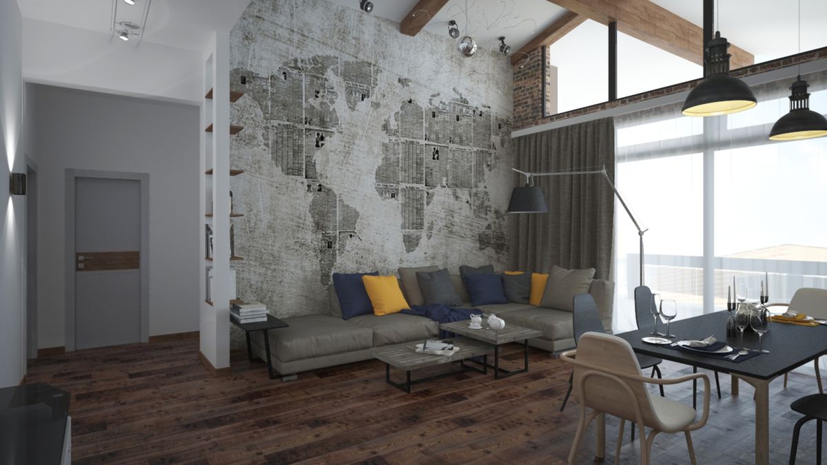 Salon style loft. Une carte du monde monochrome permet de mettre en évidence la zone de repos. La présence d'oreillers lumineux anime la pièce et la rend confortable. Les grandes fenêtres qui occupent tout un mur vous permettent d’utiliser des couleurs principalement sombres.