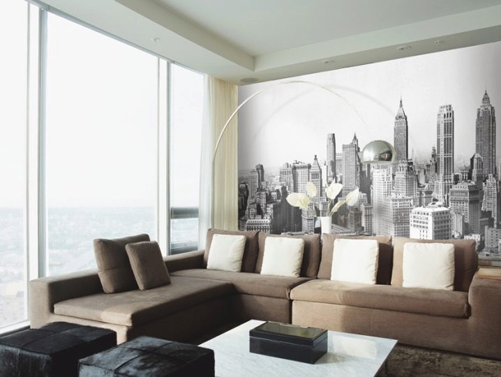 - Moderne le style du salon complétera le papier peint de n'importe quel sujet. Un élément important sera leur combinaison avec la couleur des meubles et des détails intérieurs.