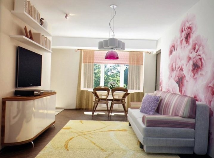 Concevez un salon typique de Khrouchtchev. Le choix est fait en faveur de pivoines romantiques sur fond blanc. Les autres éléments de la pièce sont assortis dans des tons beiges agréables. L'intégrité de l'image est obtenue en faisant correspondre les éléments de couleur (lampe et rembourrage du canapé).