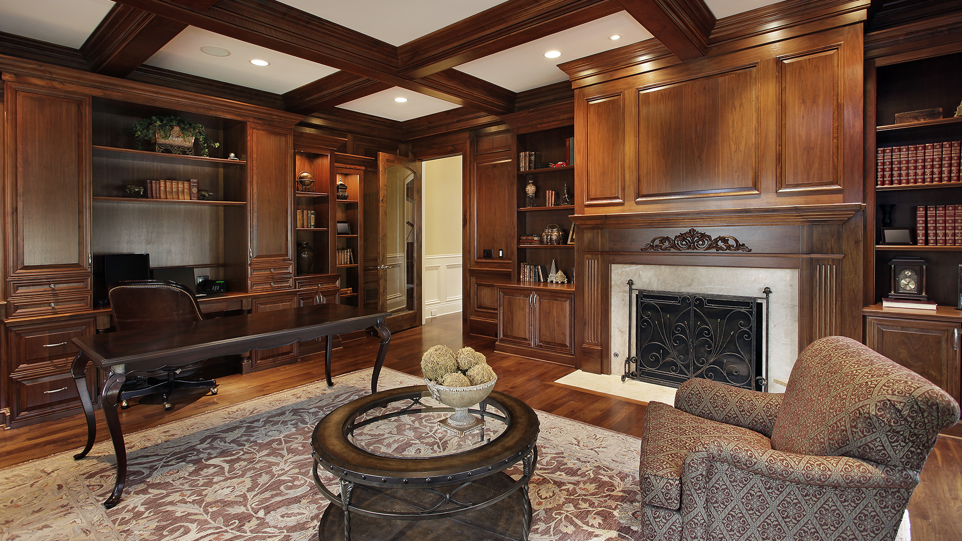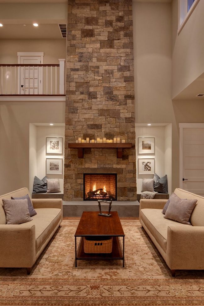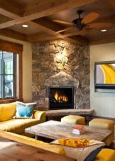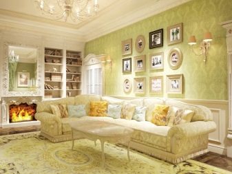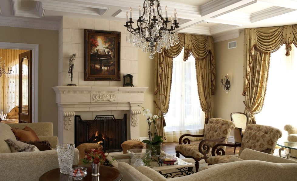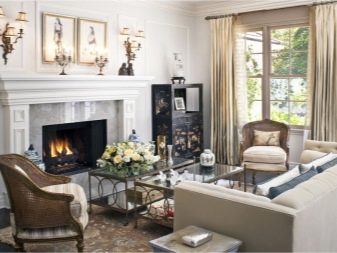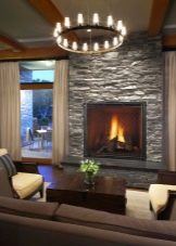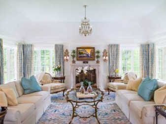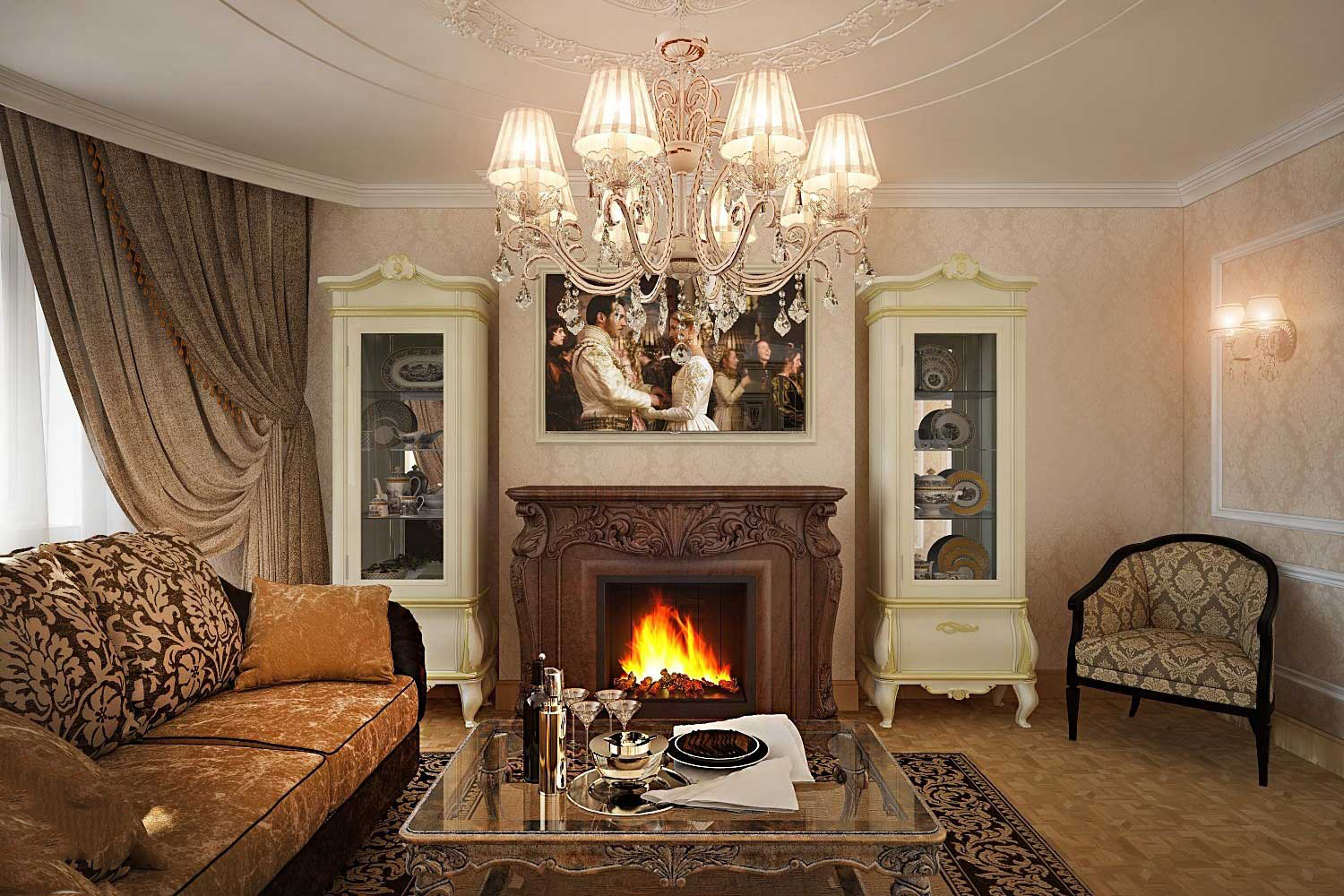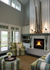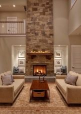 Pour donner un intérieur de luxe et de confort dans une telle pièce, vous pouvez placer une cheminée. Comme éléments décoratifs, utilisez de beaux vases, chandeliers forgés, peintures et cadres magnifiques. Il est préférable d’utiliser des éléments appariés afin d’obtenir une symétrie claire et correcte.