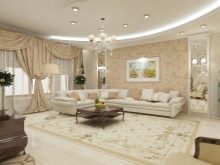 La tendance de la mode de l'année à venir est la conception du salon dans le style d'un classique. Le design classique est important car il donne le ton général à cette pièce. Dans la mise en œuvre de la finition, vous devez utiliser une couverture en bois et des matériaux en bois naturel. Le classique suggère la présence d'une symétrie dans la disposition des meubles, ainsi que d'une combinaison de couleurs de revêtements, d'armoires et d'autres éléments.