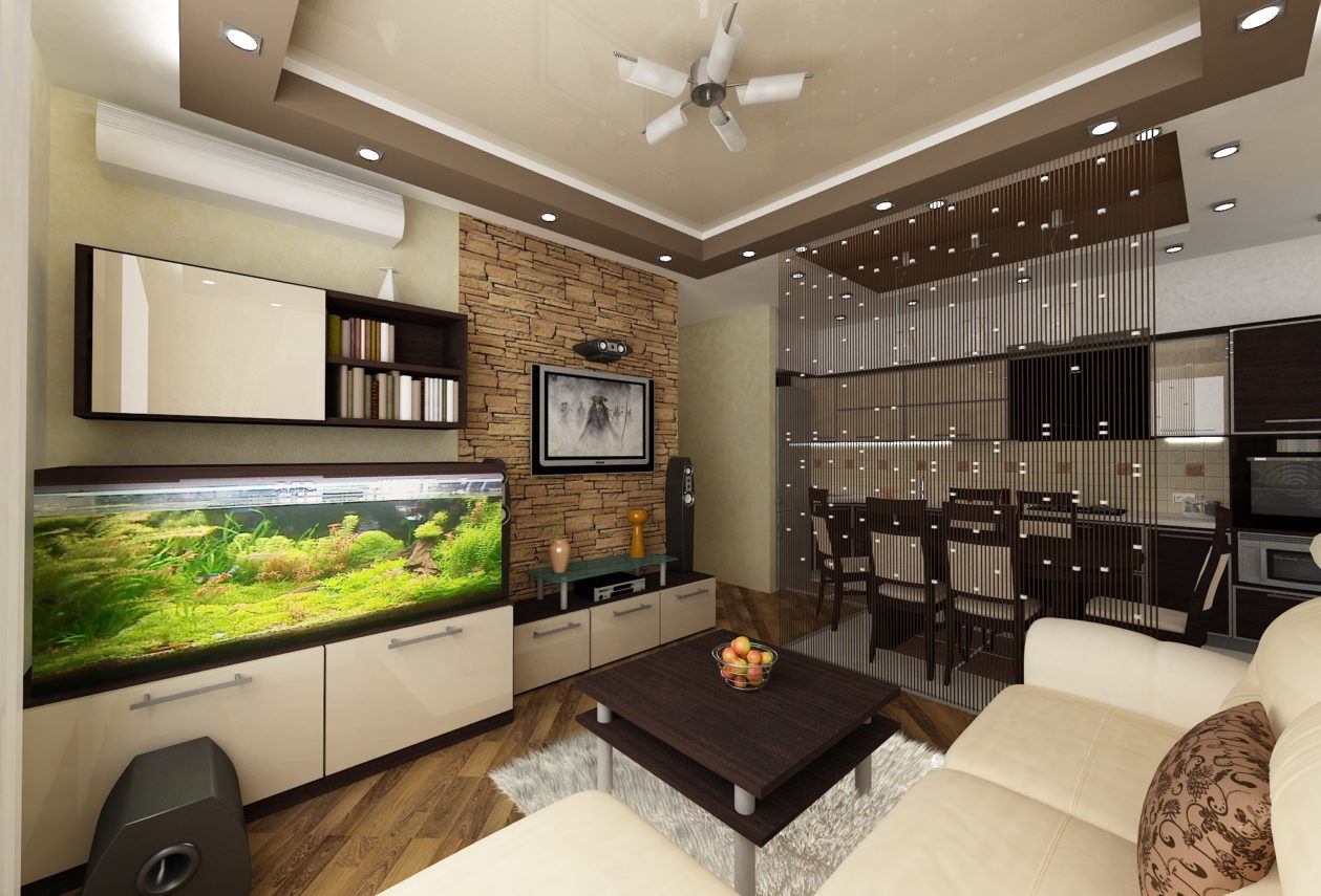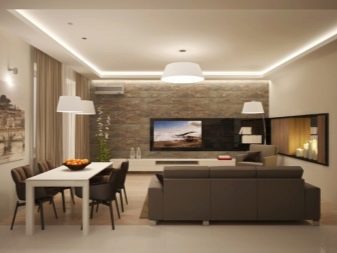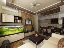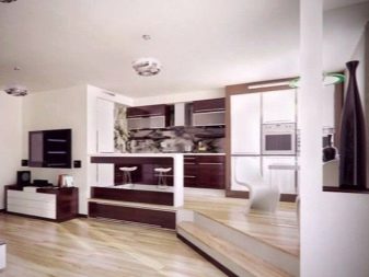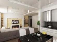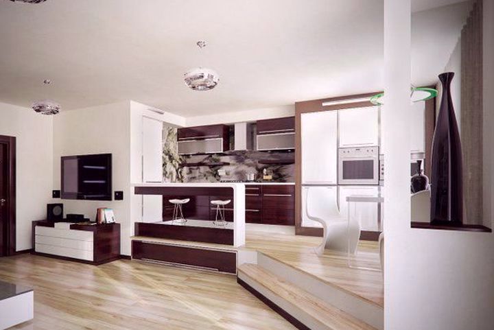 L'appartement peut également combiner salon et cuisine. Ces deux zones peuvent être divisées par une petite partition (elle ne doit pas être solide), un rack ou une barre.Vous pouvez dîner au bar, mais vous ne pouvez l’utiliser que comme une partition. Assis au bar, vous pouvez cuisiner et regarder la télévision dans le salon. Cette option de zonage est très pratique.