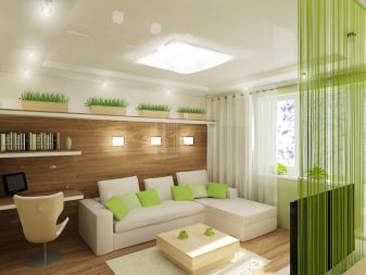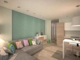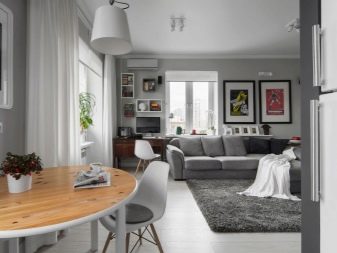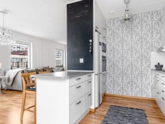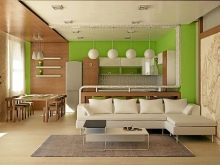 Le zonage peut être fait en utilisant différents revêtements muraux. Pour la zone d’invités, il est préférable de choisir un design plus décontracté, en plaçant les accents uniquement à l’aide de meubles rembourrés ou de tableaux, de figurines, de livres. La zone de restauration peut être aménagée de manière plus brillante et intéressante, en ramassant des chaises et des plats lumineux.