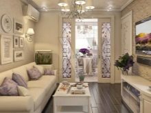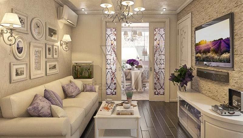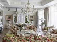 L'option suivante pour le salon est d'utiliser le style provençal. Il implique la présence de motifs français. Pour aménager un tel salon, il est préférable d’utiliser des revêtements et des meubles de délicates nuances de pistache, de rose, de lavande et de bleu clair.