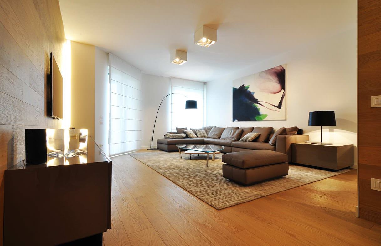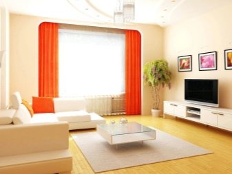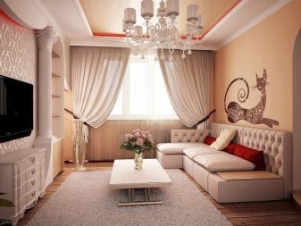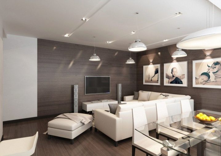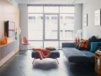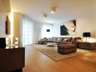 Vous pouvez décorer un tel salon en utilisant différents revêtements. Les concepteurs recommandent d'utiliser du bois, du parquet ou du stratifié pour finir le sol d'une telle pièce.