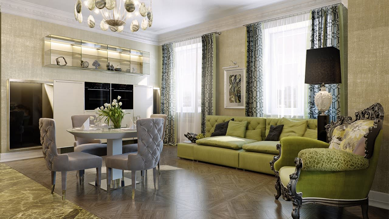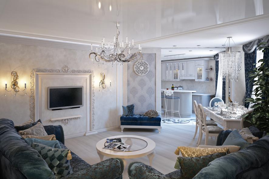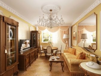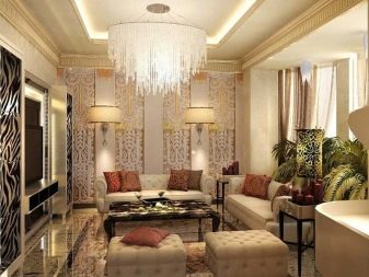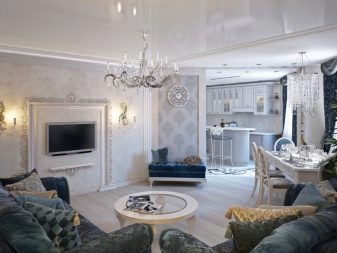 Vous pouvez combiner différents éléments: un simple plafond suspendu et un lustre orné intéressant, du papier peint sérigraphié. Vous pouvez faire des accents en accrochant des peintures luxueuses et de belles photos. Il devrait y avoir beaucoup de fenêtres et de miroirs dans les chambres.