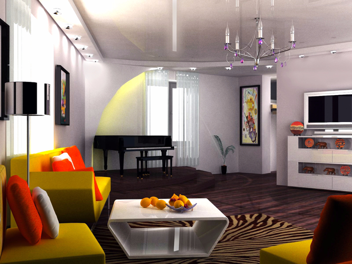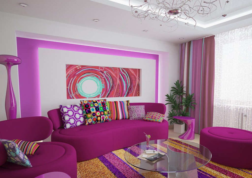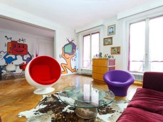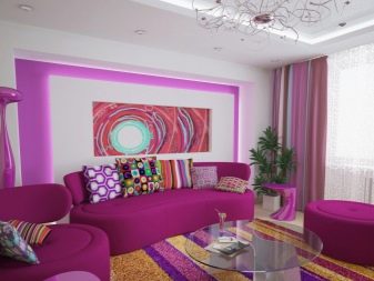 L'intérieur du salon est lumineux et coloré dans le style pop art. C’est cette option que les concepteurs considèrent comme la plus intéressante et la plus unique. Dans une telle pièce, vous pouvez placer un grand canapé en forme de lèvre, une table basse en plastique transparent sur laquelle les objets allongés vont littéralement flotter dans les airs.