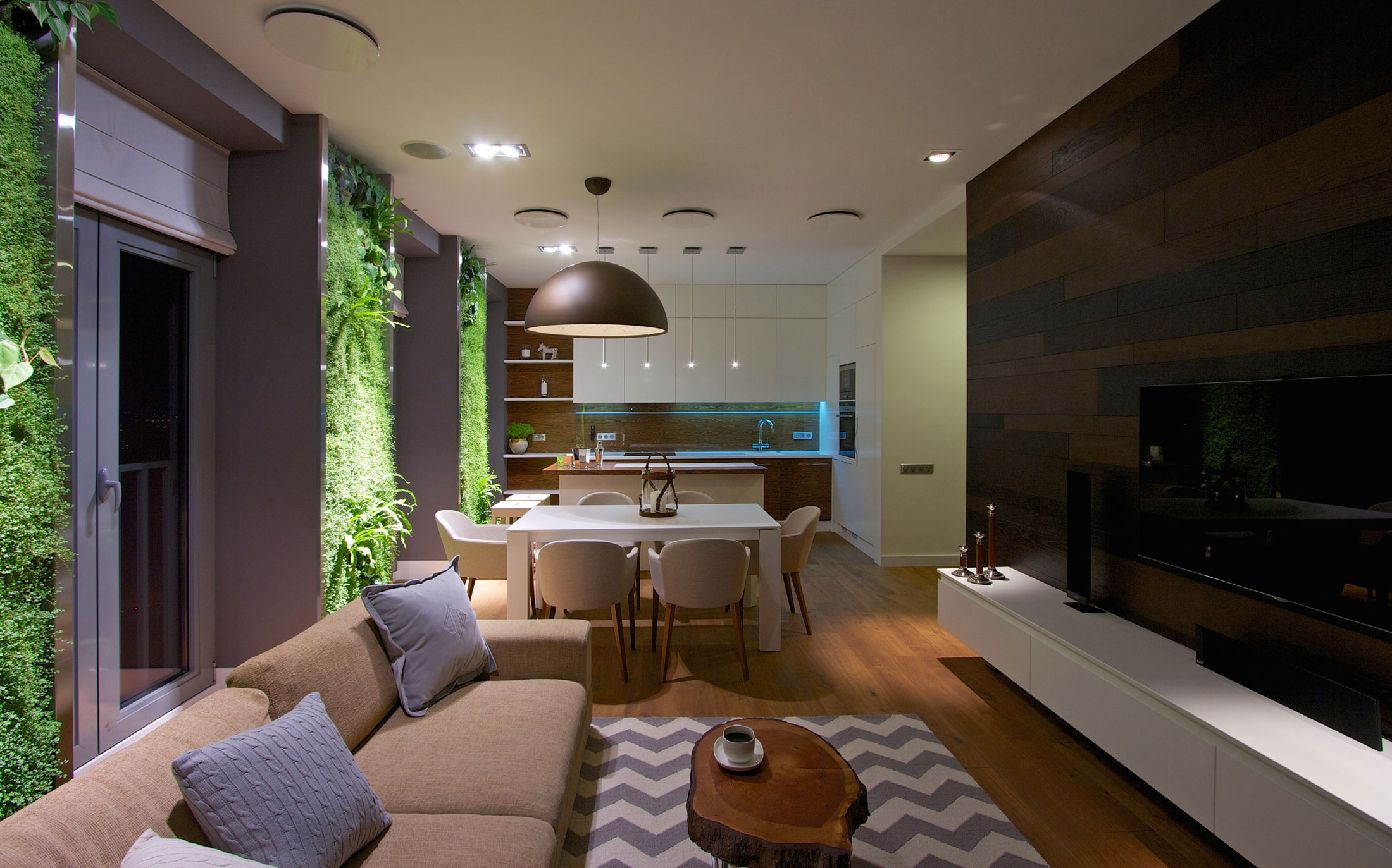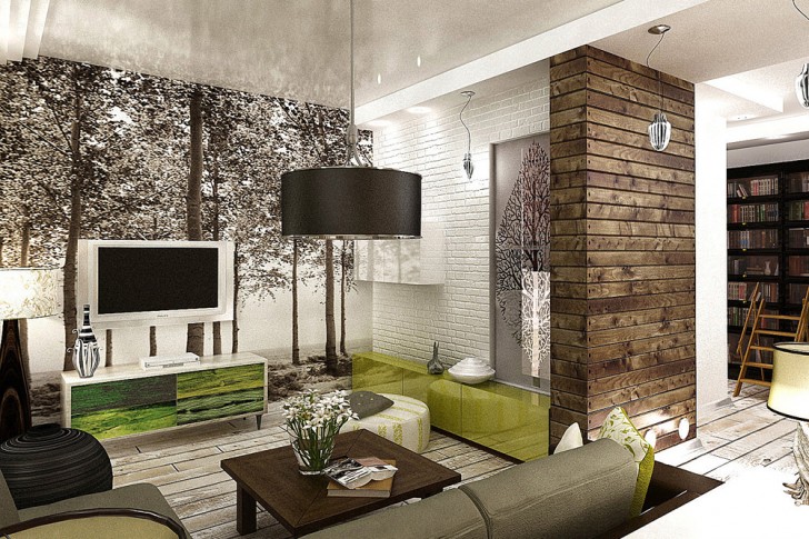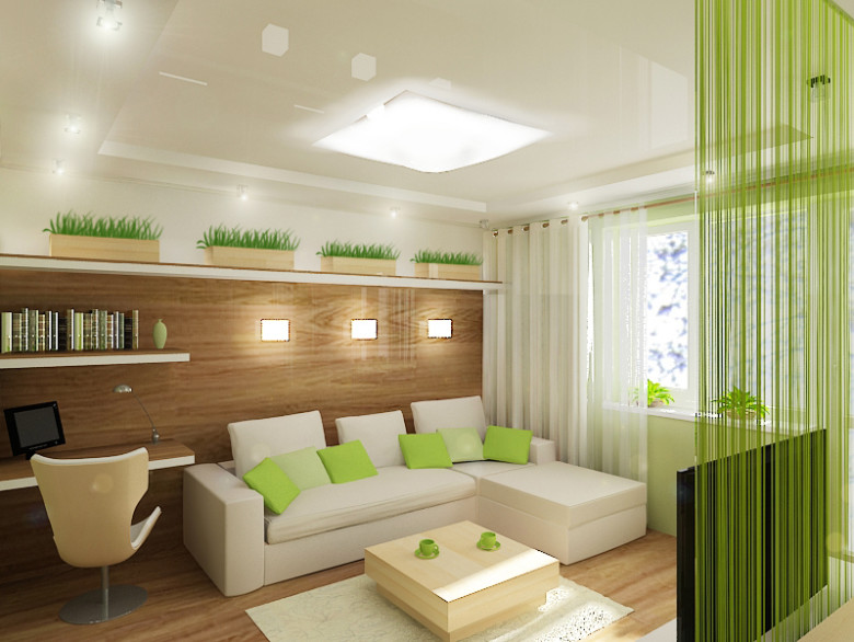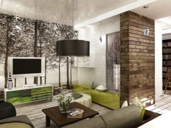 Un autre style populaire est l'eco. Il représente l'harmonie et l'unité avec la nature. Les concepteurs recommandent de rendre les salons de ce style lumineux et spacieux.Les principaux éléments décoratifs doivent être des plantes d'intérieur. Il est préférable d'utiliser uniquement des matériaux naturels pour la finition: pierre, métal, bois.