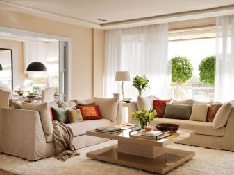 De nombreuses salles modernes les font ressembler à des salles de repos, tout en privilégiant des tons beiges apaisants. Ils créent une sensation de calme et de tranquillité et vous permettent de vous détendre après une dure journée de travail. De plus, les concepteurs offrent maintenant une grande variété de nuances beiges, en combinant lesquelles, vous pouvez créer un dégradé intéressant (et même des transitions contrastées).