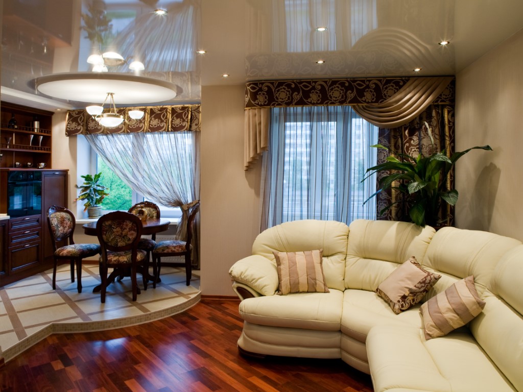 Dans ce cas, le zonage peut être effectué de la manière suivante: replacez le canapé dans la salle à manger et organisez ainsi un groupe de meubles de détente et un coin salle à manger séparé avec une grande table et des chaises. Le zonage peut être fait en utilisant le sol. Un canapé avec des sièges et une table basse dans le salon peuvent être placés sur un petit podium, tandis que la salle à manger sera au niveau habituel.