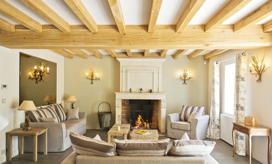Vous pouvez utiliser le plafond, qui est un plafond de rondins épais. Ils peuvent ne pas être réels, mais en polyuréthane, avec l’imitation d’une surface en bois.