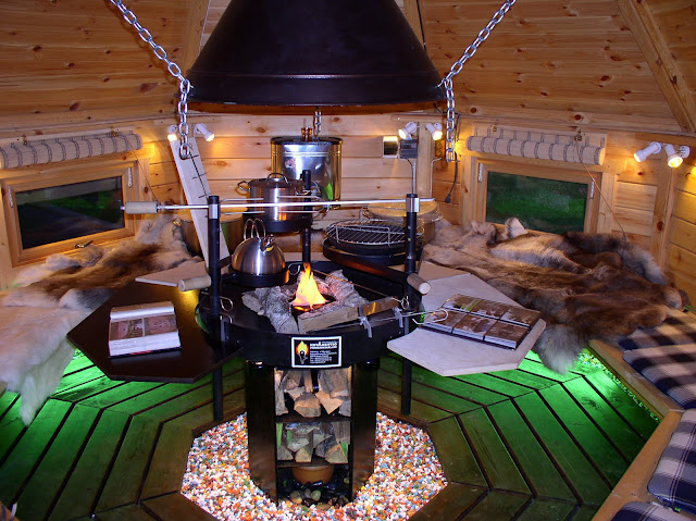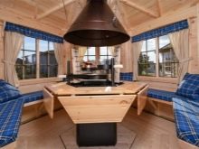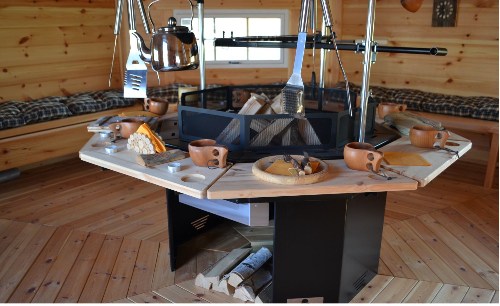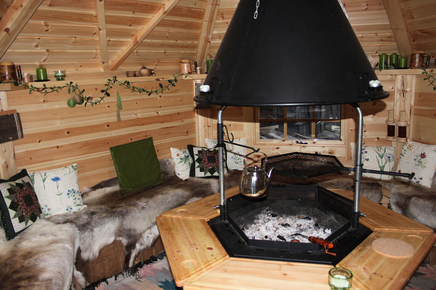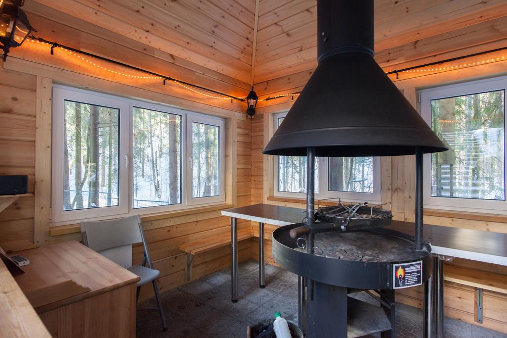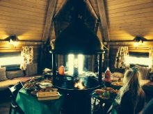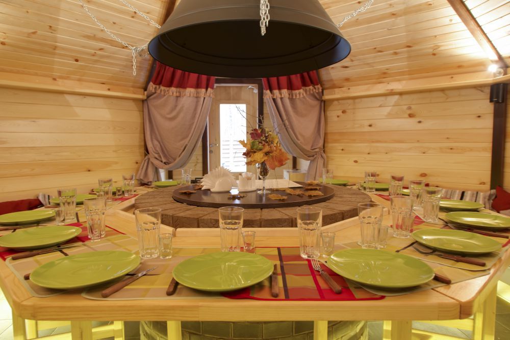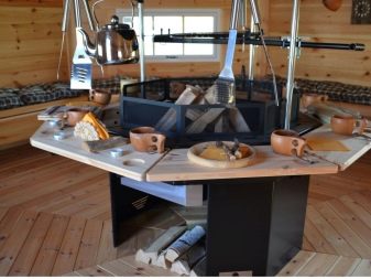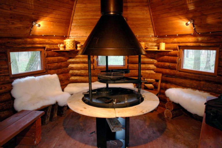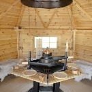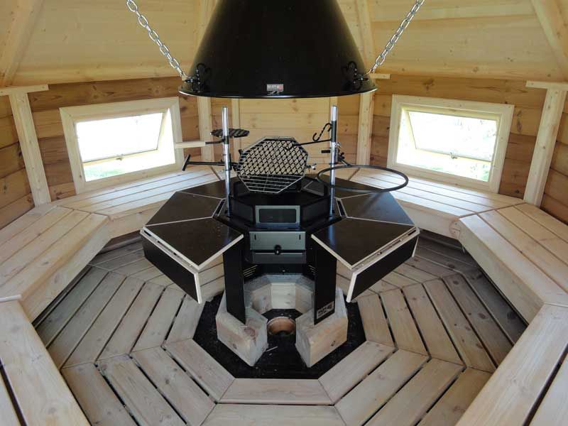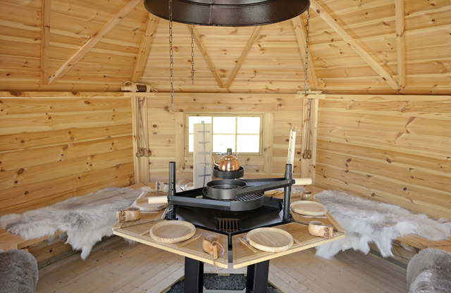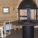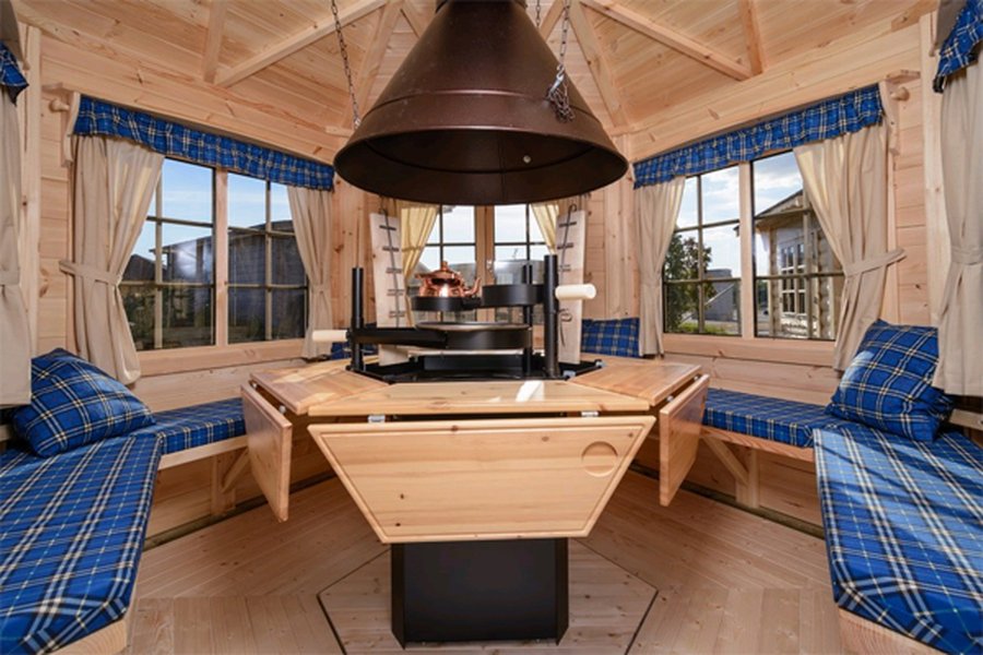 L'intérieur des maisons dites finlandaises est standardisé. Au centre de la pièce, il y a un four universel et des accessoires supplémentaires tels qu'un fumoir, une broche et un barbecue. En outre, pour un design de passe-temps confortable, complétez le plateau de table et les bancs, ornés de peaux d'animaux ou d'oreillers.