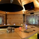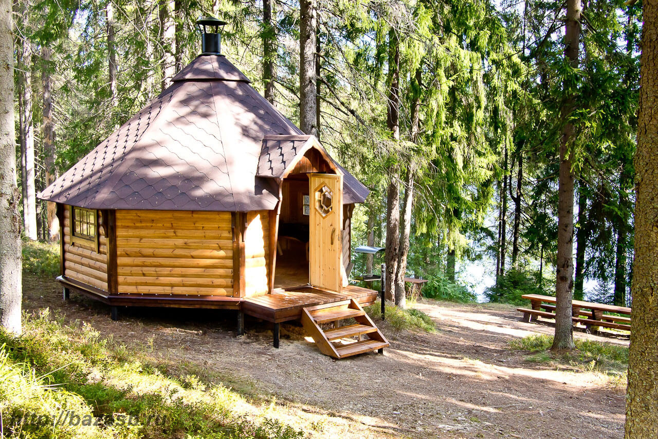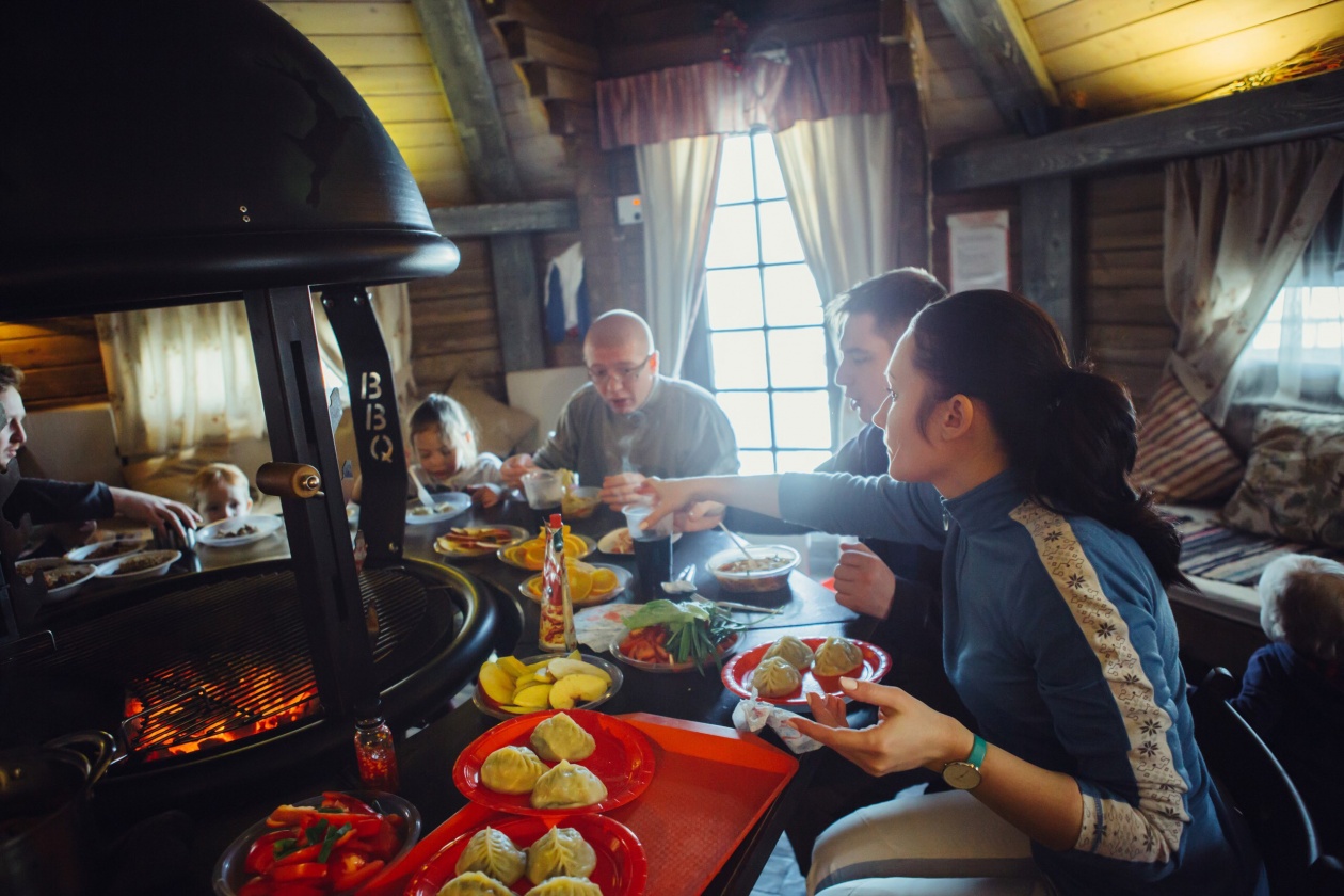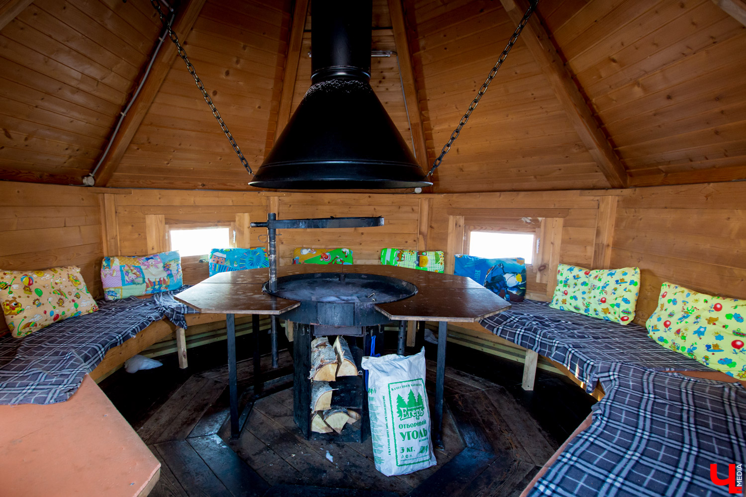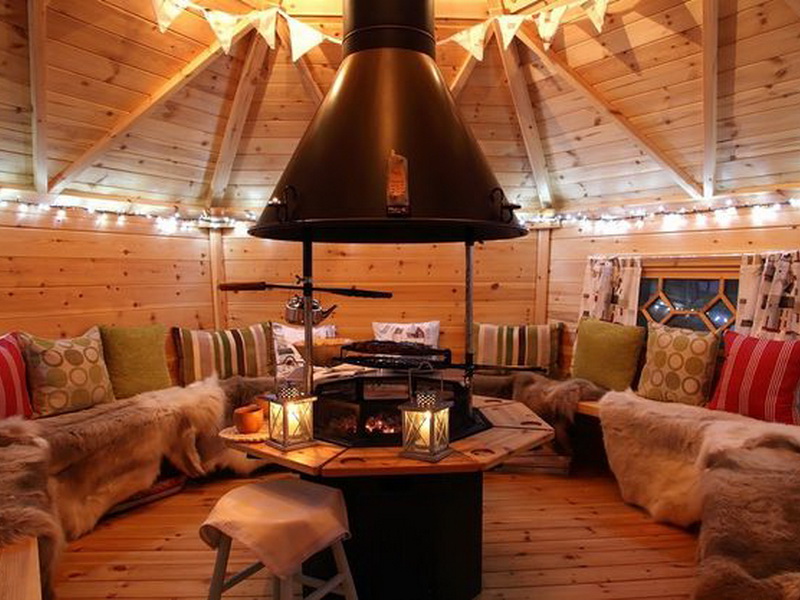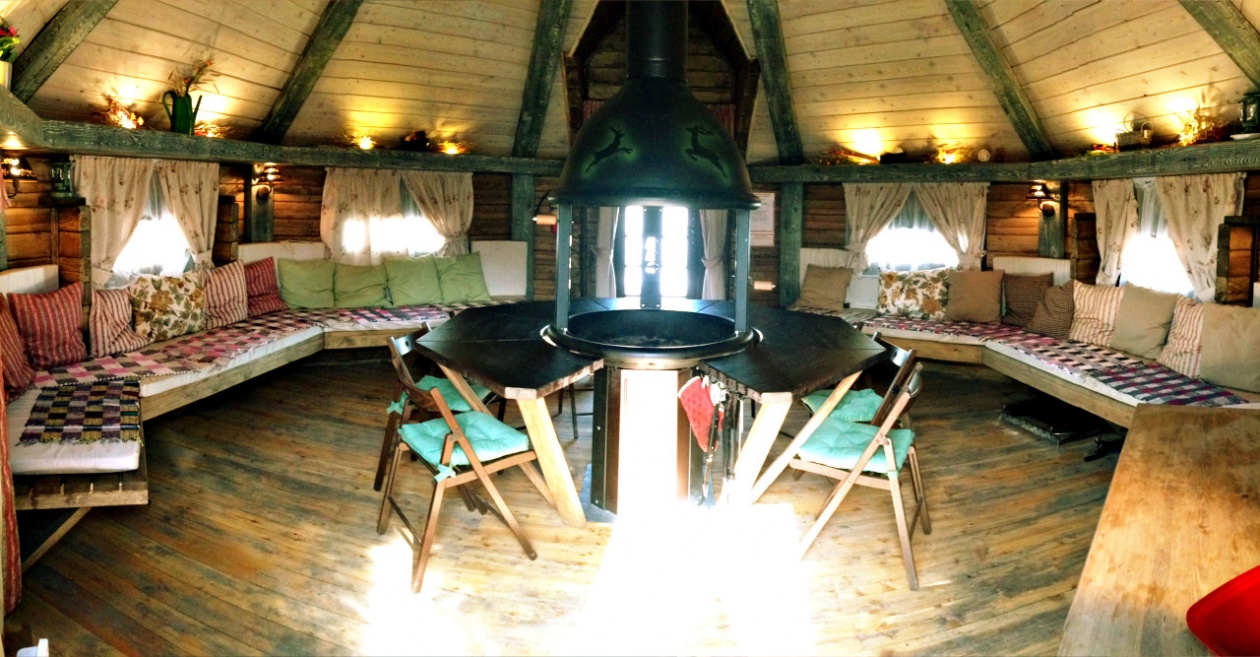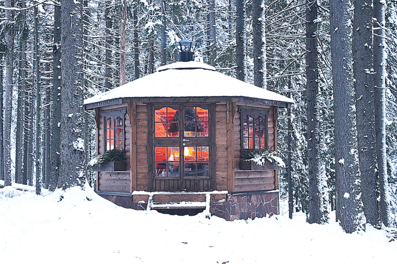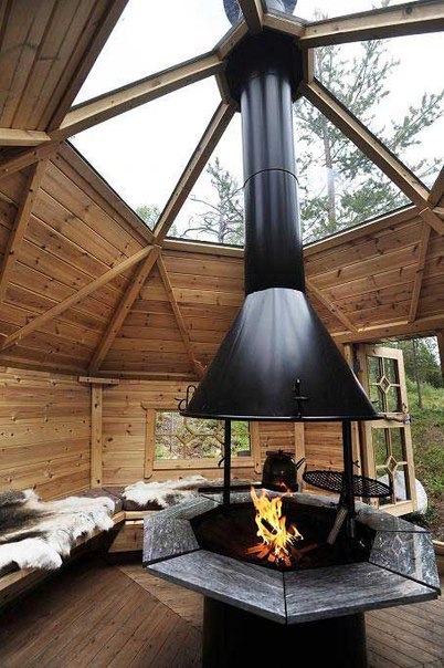 L'intérieur des maisons dites finlandaises est standardisé. Au centre de la pièce, il y a un four universel et des accessoires supplémentaires tels qu'un fumoir, une broche et un barbecue. En outre, pour un design de passe-temps confortable, complétez le plateau de table et les bancs, ornés de peaux d'animaux ou d'oreillers.