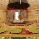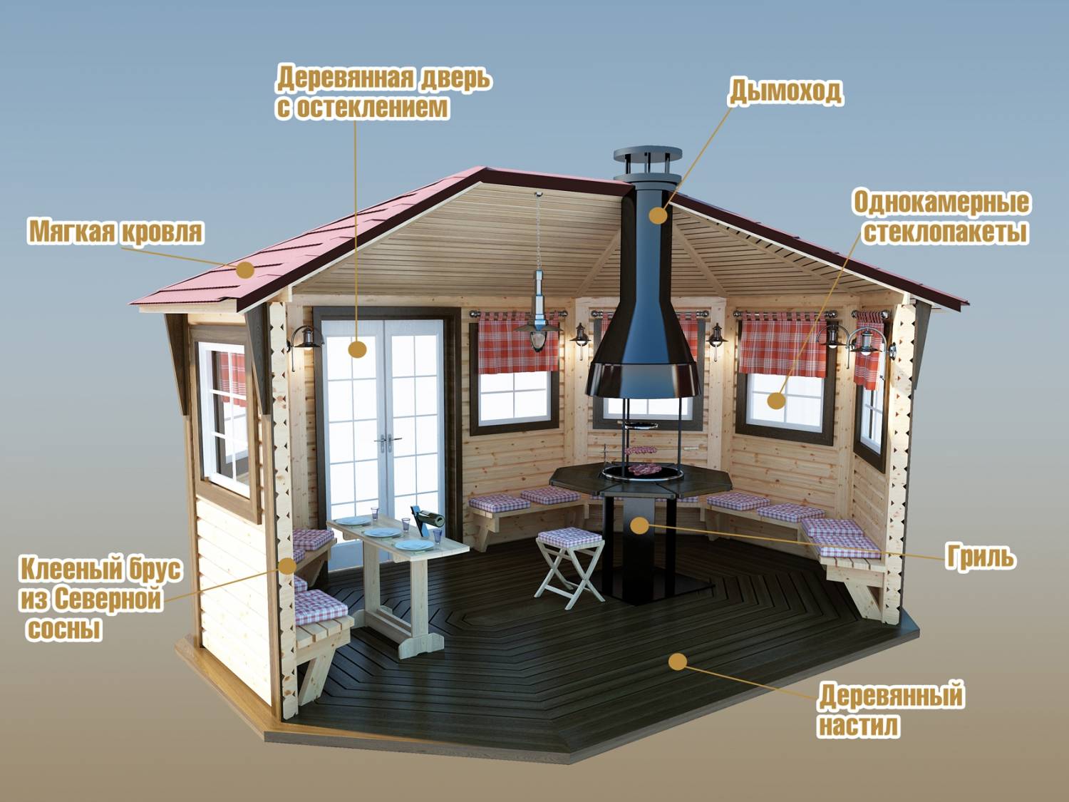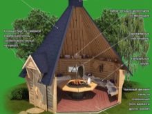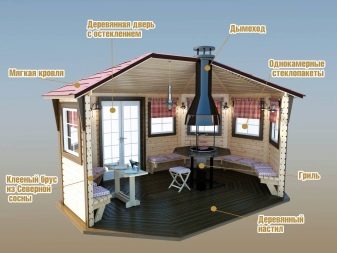 Un indicateur important pour le projet est le matériau à partir duquel la maison sera installée. En règle générale il est construit à partir d'un mini-bar, mais vous pouvez utiliser un tableau de coupe.La disposition interne doit être calculée de manière à ce que la surface de la pièce soit divisée en deux parties: la plus grande est destinée à la table et la plus petite à la zone de repos.