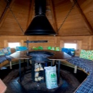 - Complétez le bâtiment avec des salles pour des soins de spa. En utilisant la chaleur du foyer, vous pouvez construire un bon sauna. Ainsi, à l'intérieur du belvédère apparaîtra non seulement un endroit pour une table, mais aussi un hammam. En outre, les magasins sont les meilleurs pour se plier.Si nécessaire, ils agiront comme un lit.
