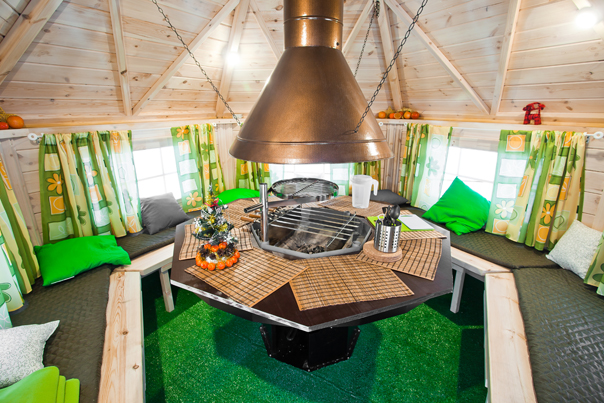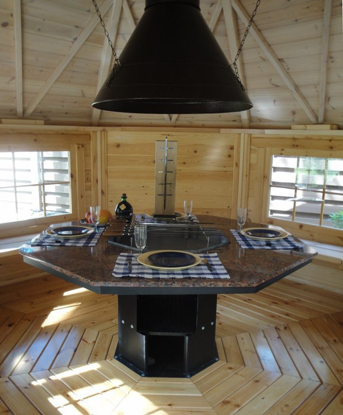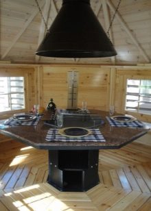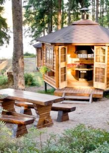 La maison du gril est une tonnelle qui vous permet de cuisiner des aliments directement à l'intérieur du bâtiment. La principale caractéristique de cette structure est qu’elle peut être utilisée aussi bien en été qu’en hiver. Habituellement, les grils sont construits en bois massif sous la forme d'une structure hexagonale fermée, qui a une porte et des fenêtres. Les structures de fondation, en règle générale, un ensemble de matériaux durables. Le toit des bâtiments est en bois naturel, ce qui lui donne une forme triangulaire. Installez extérieurement une cheminée sur le toit, qui est reliée au foyer.