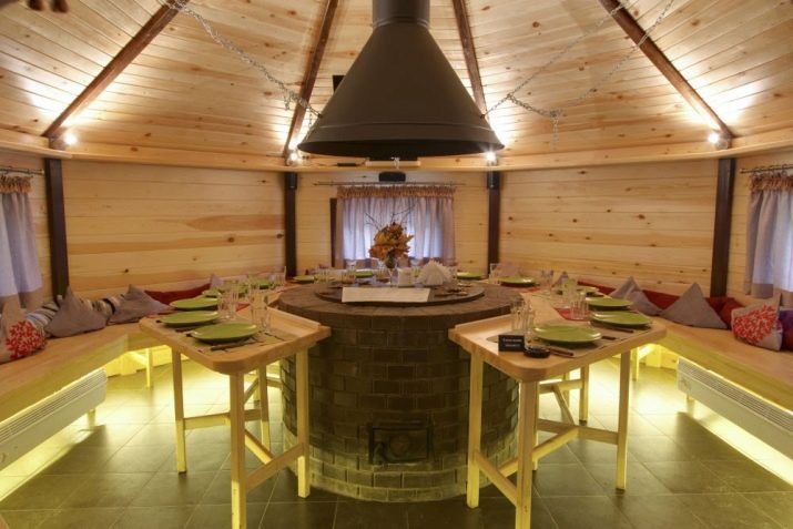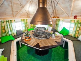 - Pensez à la bonne mise en page. Habituellement, une grille avec une cheminée et une hotte est placée au centre de la maison et des bancs sont placés le long des murs.