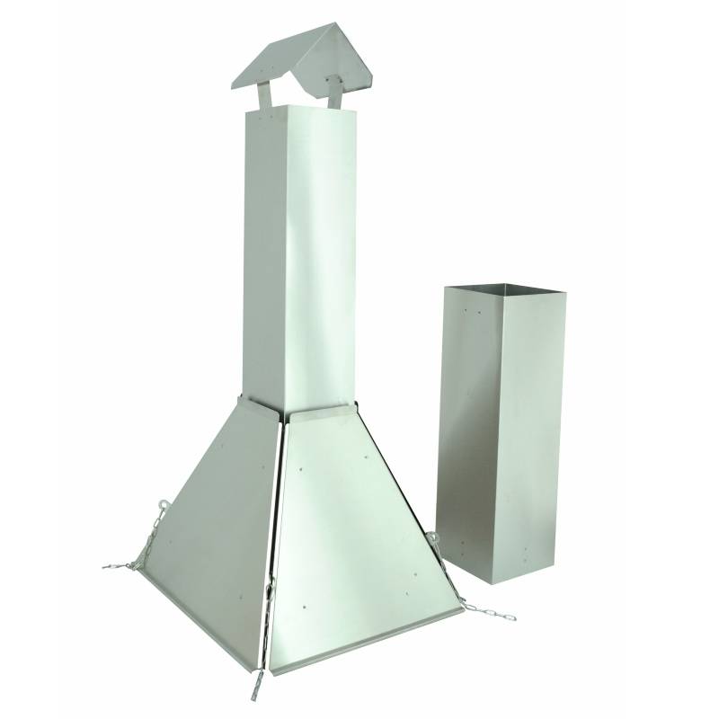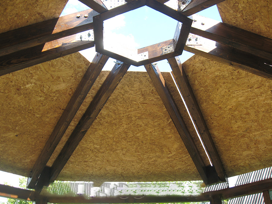 La prochaine étape sera l'installation du toit. Pour ce faire, assemblez d'abord son cadre de planches de section 50 × 100 mm. Il est préférable de choisir un design hexagonal., grâce à quoi le diamètre intérieur créera un hexagone proportionnel au tube pour le foyer.La base du toit sert de chevrons, préparés à partir de planches à rebords. Ils doivent être fixés avec des coins métalliques et des vis.