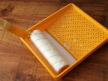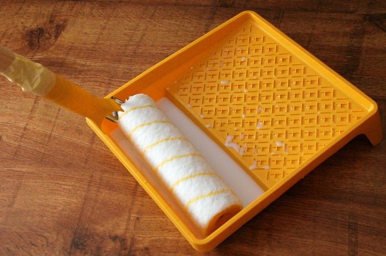 - Le mélange est versé dans un récipient en plastique. Le rouleau est revêtu avec l'outil, puis plusieurs mouvements sont effectués sur la surface nervurée de la palette pour éliminer l'excès de matériau de l'outil.