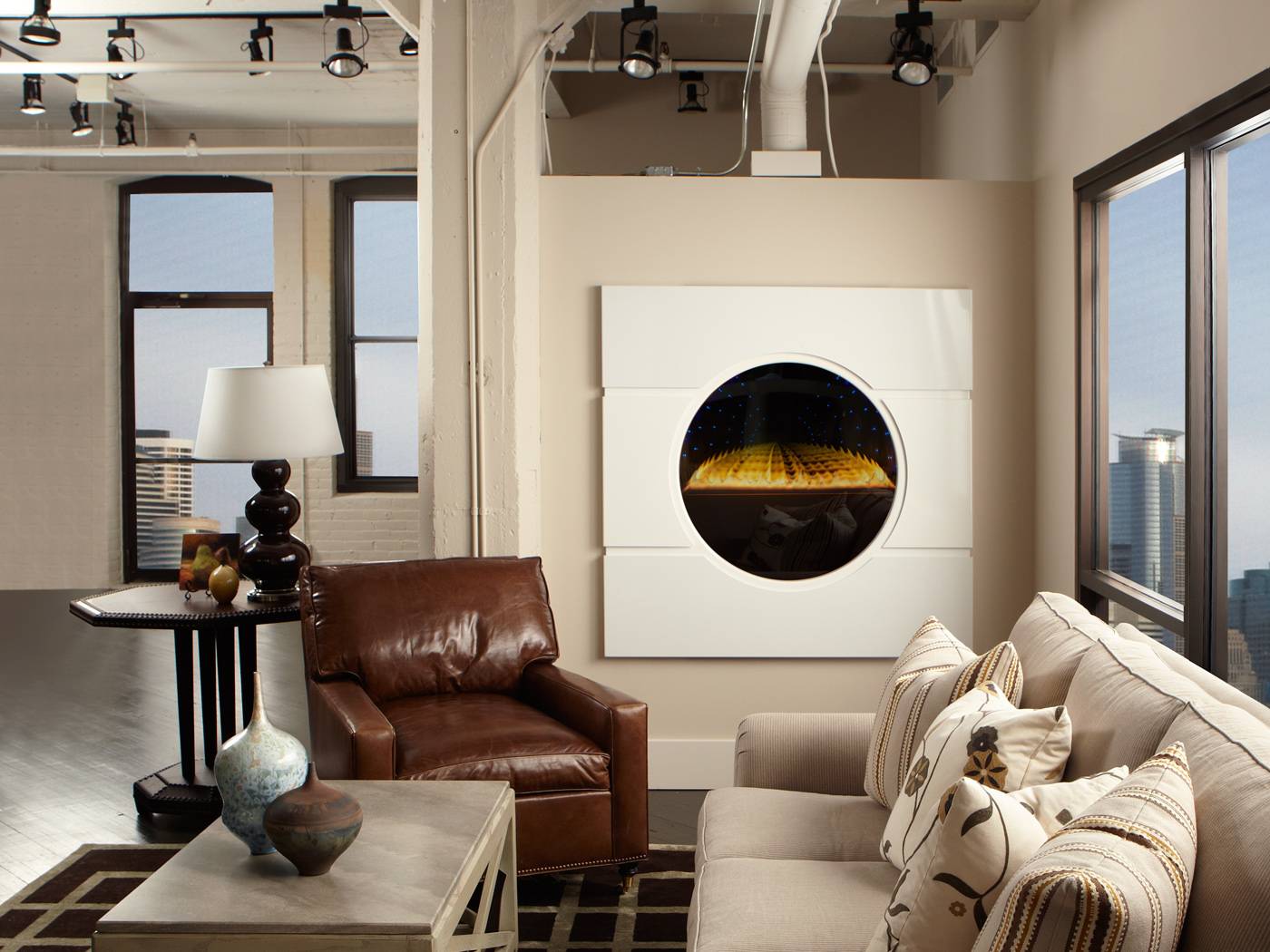 Les appareils muraux sont un modèle intégré qui peut économiser la taille d’une maison de campagne ou d’un appartement. Il convient de noter qu’un tel foyer électrique n’est pas si facile à suspendre, car vous devez d’abord équiper une niche, en fonction de la taille de l’appareil. Ce type ressemble à la télévision, dans laquelle le tir réel est le centre d'attention. Un tel foyer électrique peut être suspendu au-dessus du téléviseur ou il existe des versions plus coûteuses dans lesquelles le téléviseur est monté avec la fonction Real Flame. Dans ces modèles, une atmosphère de feu crédible est créée. Certes, le prix d’un tel foyer est très élevé.