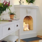 Falshkamina à l'intérieur est une très belle addition, ce qui donne le confort du salon. Vous pouvez jouer le genre de flamme ardente de plusieurs façons, en plus d'acheter un faux feu. Par exemple, certains créent un portail en plâtre et déposent du bois de chauffage à l'intérieur, puis des bougies sont placées à côté du bois de chauffage, ce qui crée l'apparence d'une flamme ardente dans le foyer. Une autre méthode non primitive consiste à acheter un cadre photo électronique qui reproduira l’effet d’une flamme ardente lors du choix du mode approprié. Ces espèces sont appelées imitations.