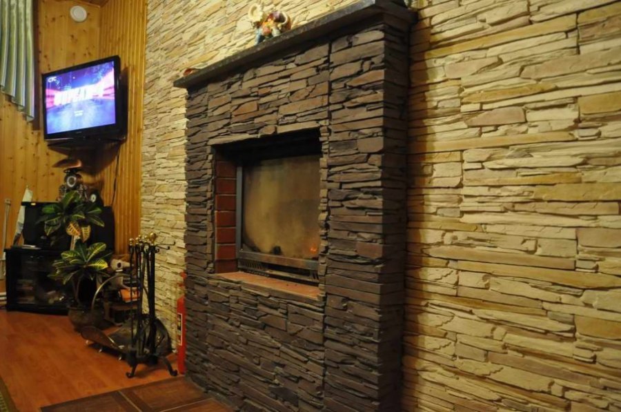 - Pierre flexible. Un des développements les plus récents, qui permet de réduire l'installation de la façade du foyer à apporter au sol en linoléum. Il est fabriqué sous forme de feuilles de dimensions 960x480mm et d'épaisseur 1,5-4mm. Il se compose de copeaux de marbre naturel et a une surface rugueuse. La texture et la couleur de cette pierre sont similaires aux pierres de finition naturelles et offrent des possibilités illimitées de créer divers intérieurs en peu de temps, y compris «sous une pierre sauvage». Son faible poids et sa flexibilité permettent de le monter sur n’importe quelle surface. Les grandes tailles de feuilles éliminent le besoin de coulis fastidieux. La pierre flexible ne contient pas de substances nocives et est sans danger pour la santé. Parfaitement coupé, même avec des ciseaux de bureau.