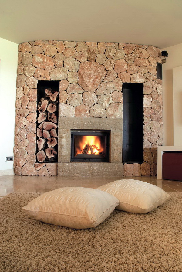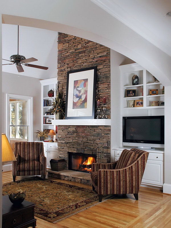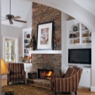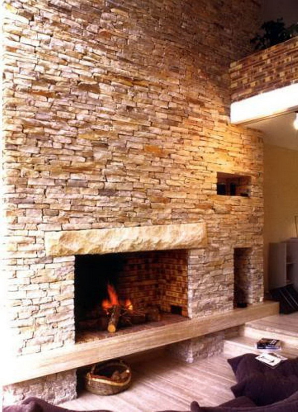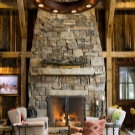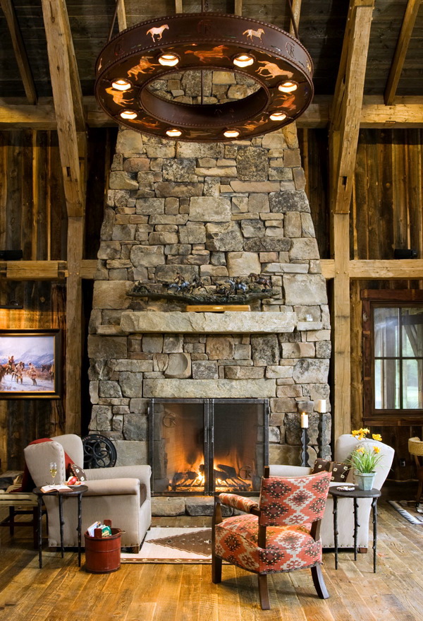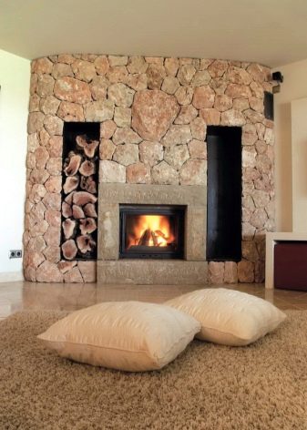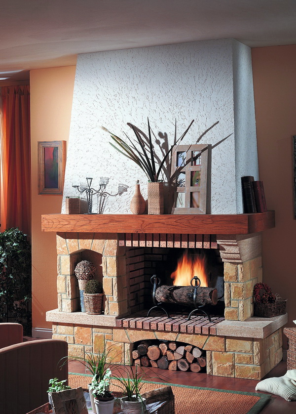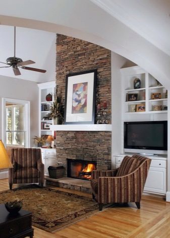 Le style campagnard se caractérise par une cheminée en forme de D avec une niche pour le bois de chauffage et des poutres décoratives pouvant servir d'étagères. Pour rendre l’intérieur harmonieux, vous pouvez installer un meuble en osier, un canapé en textile dans la pièce avec une cheminée, décorer des objets fabriqués à la main.