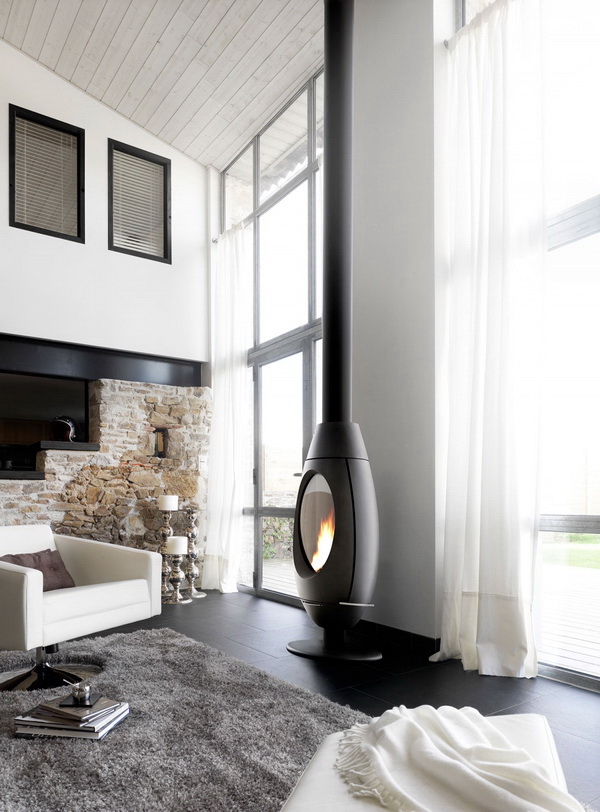 Le poêle à bois peut parfaitement résoudre toutes les tâches intérieures. Les poêles d'angle économisent de l'espace et s'intègrent dans presque tous les modèles. Pour le style moderne, vous pouvez choisir une cheminée avec des fenêtres panoramiques et lui donner un rôle de premier plan en la plaçant au centre de la pièce. La cheminée encastrée dans le mur ne fera que souligner l'exclusivité du design high-tech. Un poêle traditionnel avec un banc de poêle décorera la maison dans le style russe.