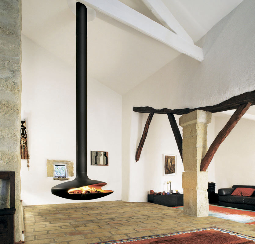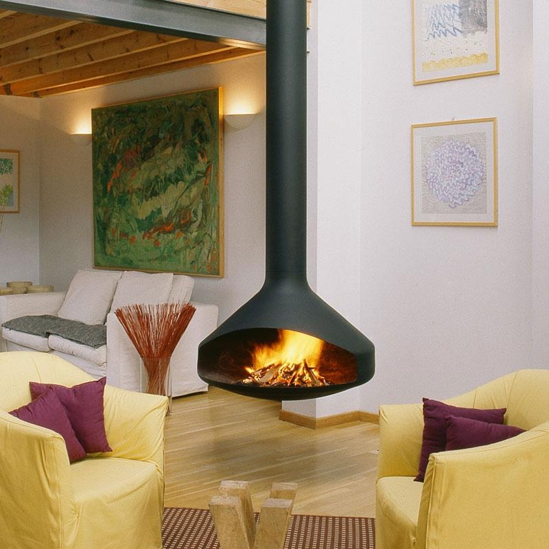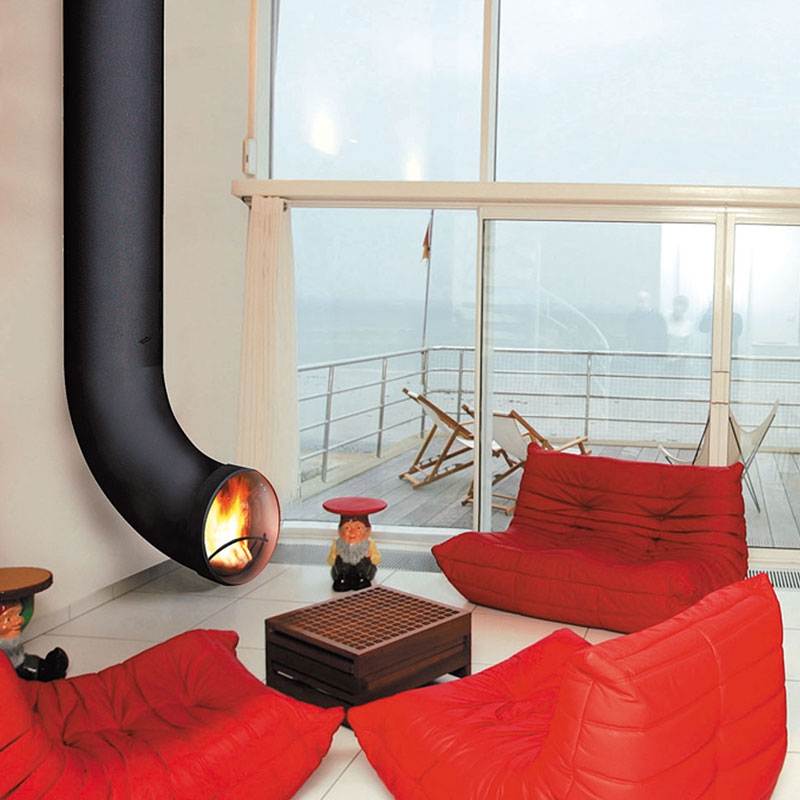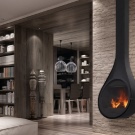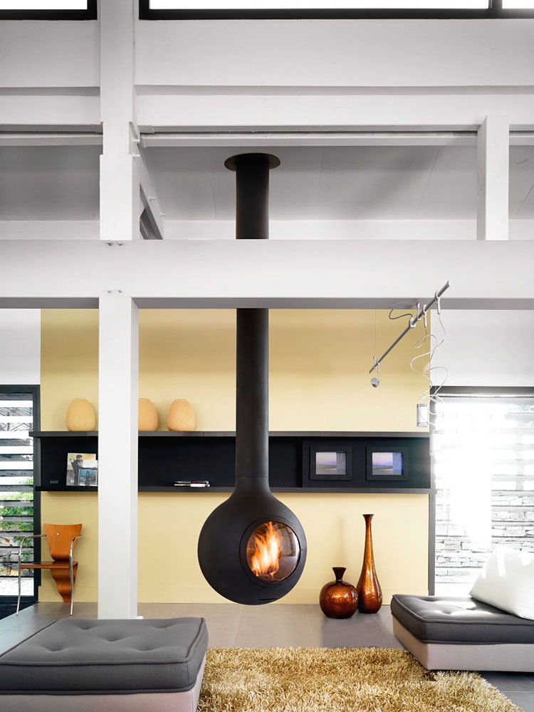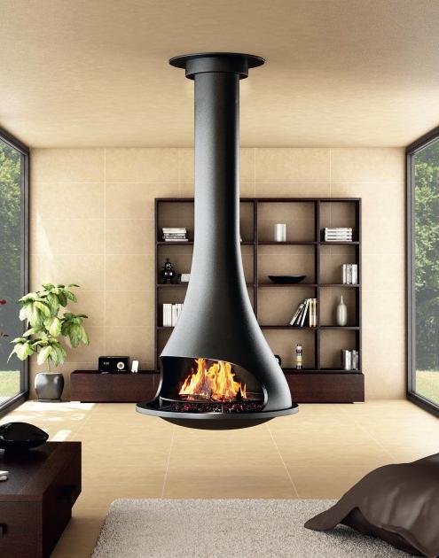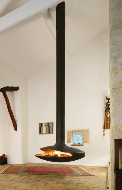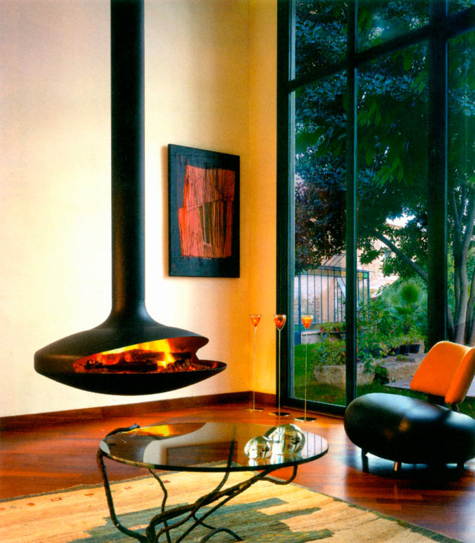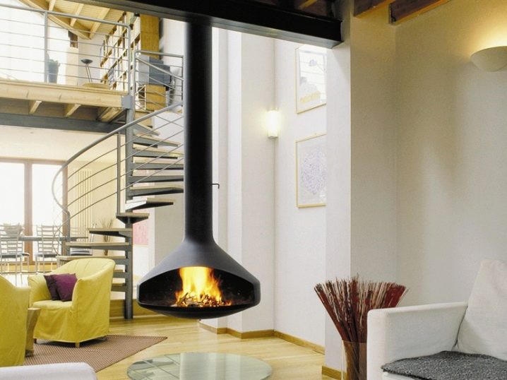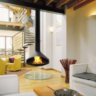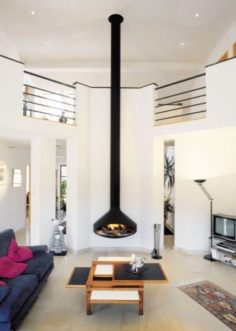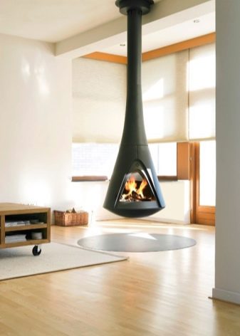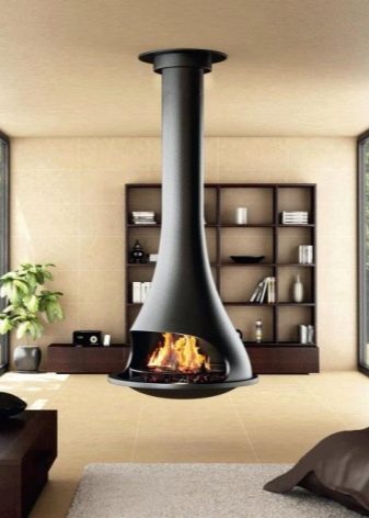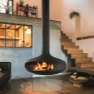 Pour la décoration moderne des appartements, les cheminées suspendues sont l'expression la plus frappante de la déconstruction. Avec eux, l’idée même de confort et de foyer familial est différente. Fondamentalement, parce que ces foyers sont fixés au plafond, bien qu'il existe des structures similaires et fixés au mur.