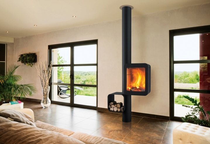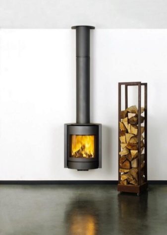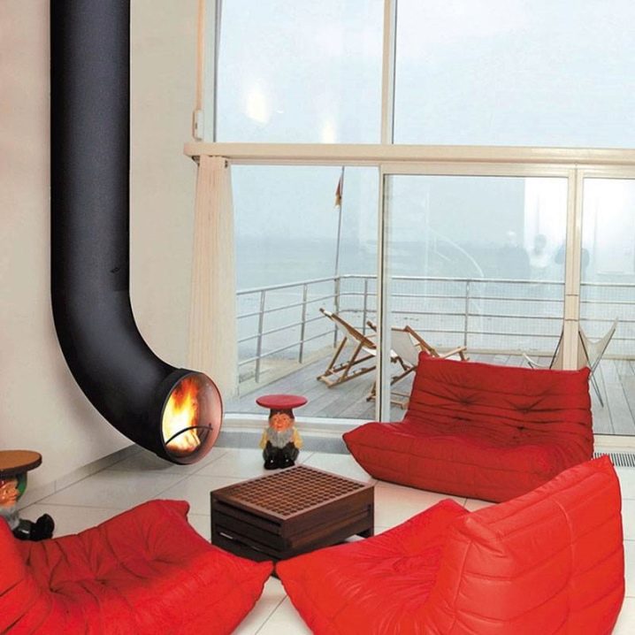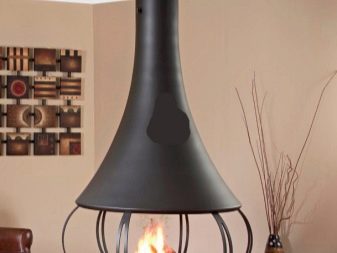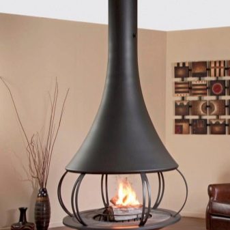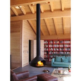 Un tel design de cheminée exotique peut avoir un effet encore plus important si la chambre de combustion est tournée - il est clair que cela nécessitera quelques ajouts dans tous les équipements de la cheminée suspendue.