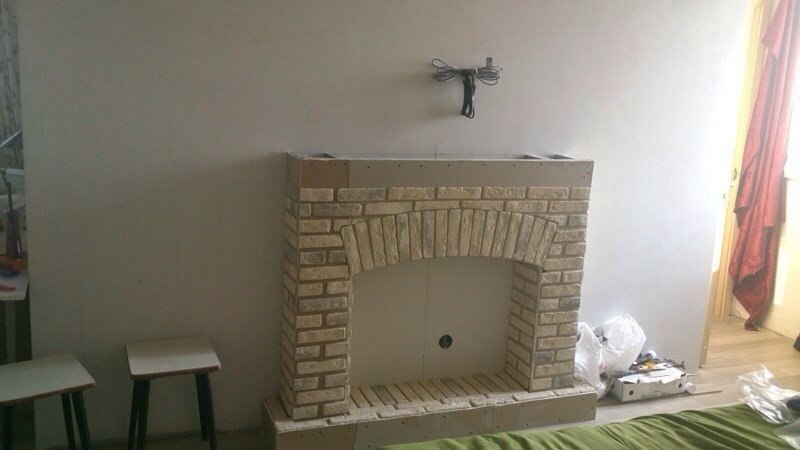 - Au-dessus du portail, une soi-disant cheminée est en construction à partir d'une double couche de gypse. C'est sur celle-ci que vous placerez vos cadres avec des photos et autres bibelots. Puisqu'une certaine charge va tomber dessus, il est nécessaire de le renforcer avec un profilé supplémentaire et de le fixer au mur. Visuellement, l'étagère devrait ressembler à celle du portail;