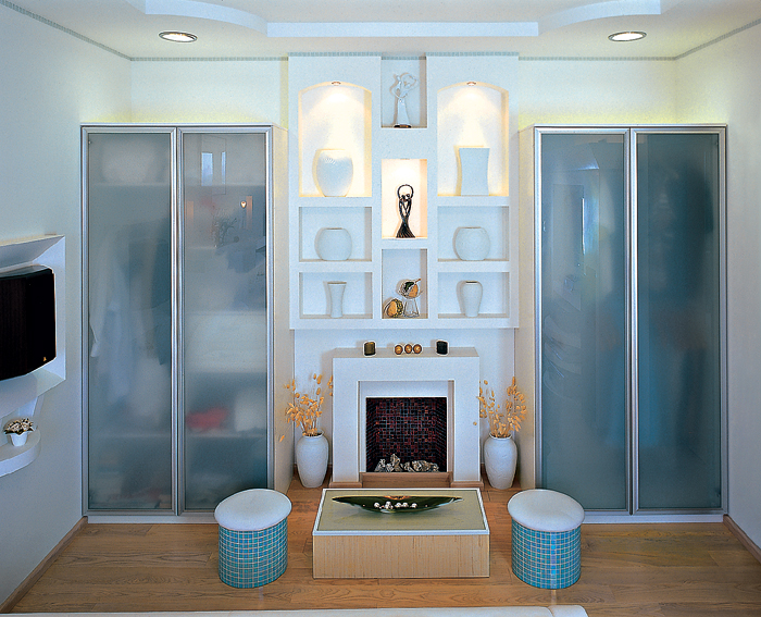 Cette cheminée est "décorative". Il ne pourra pas se réchauffer physiquement, mais il pourra assouvir son âme, car un tel appareil a l’air très élégant, inhabituel et édifiant. Les foyers décoratifs pour cloisons sèches sont beaucoup plus faciles à fabriquer et à installer que ceux en métal. Il n’ya plus de problèmes techniques ici, mais plus de créativité, d’imagination et de créativité. Cette conception vous permet de traduire dans la vie toutes les idées de conception et les impulsions créatives.