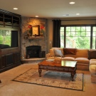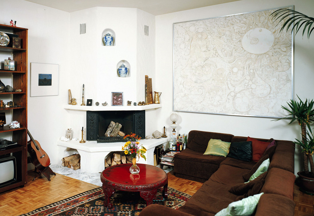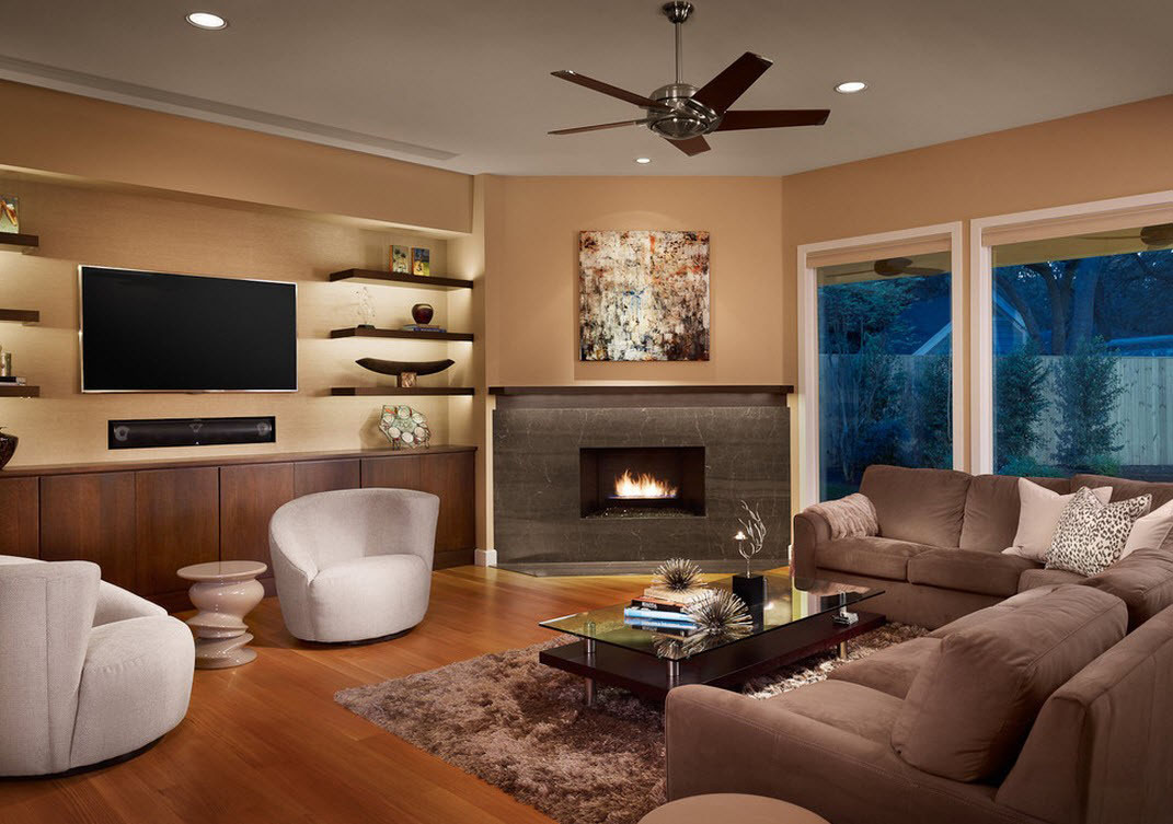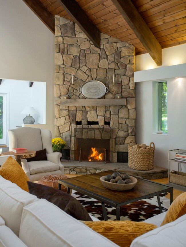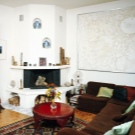 La particularité de la cheminée d'angle dans son design extérieur ne prend pas beaucoup de place, mais elle a l'air assez harmonieuse et attire l'attention de tous. Lors de l’organisation du mobilier, les concepteurs recommandent d’examiner avec soin le coin salon dans le hall. Par exemple, le salon est souvent une pièce qui n’est pas trop encombrée de meubles. De grandes fenêtres avec des rideaux d'air légers et d'énormes rideaux, une table à manger avec de belles chaises, un coin salon avec un canapé et des fauteuils confortables ou des fauteuils à bascule, quelques étagères ou étagères hautes avec vos livres préférés suffisent pour un salon. Près du foyer de chaleur sur le sol, vous pouvez poser un revêtement de sol dense où vous pourrez passer des soirées romantiques avec votre bien-aimé.