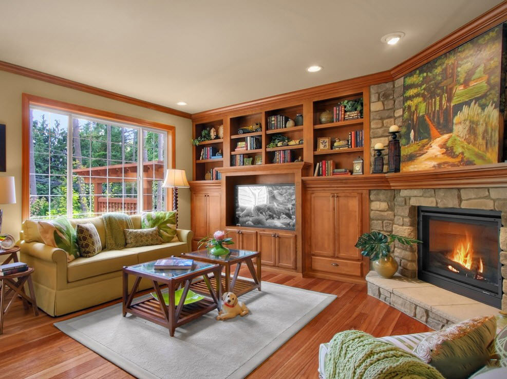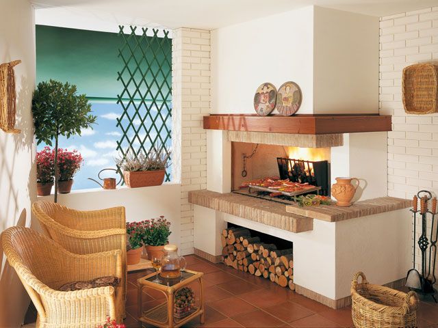 - Type symétrique considéré comme le plus populaire. La cheminée est l'élément central et principal de la salle.