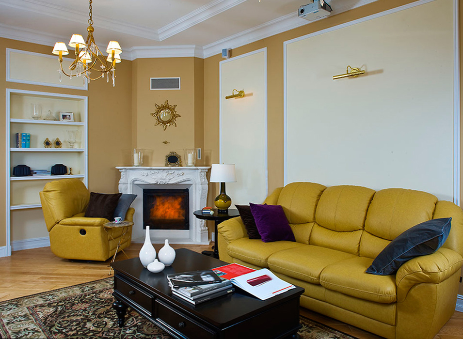 - Falshkaminy sont très en demande, car tout le monde ne peut pas se permettre d’installer un vrai foyer dans la maison. Et cette option convient à une décoration intérieure élégante du salon.